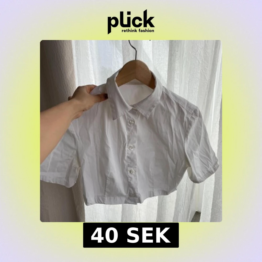 Säljer en stilren vit croppad skjorta med korta ärmar och klassisk krage. Skjortan har knappar framtill. Perfekt för en trendig och avslappnad look.