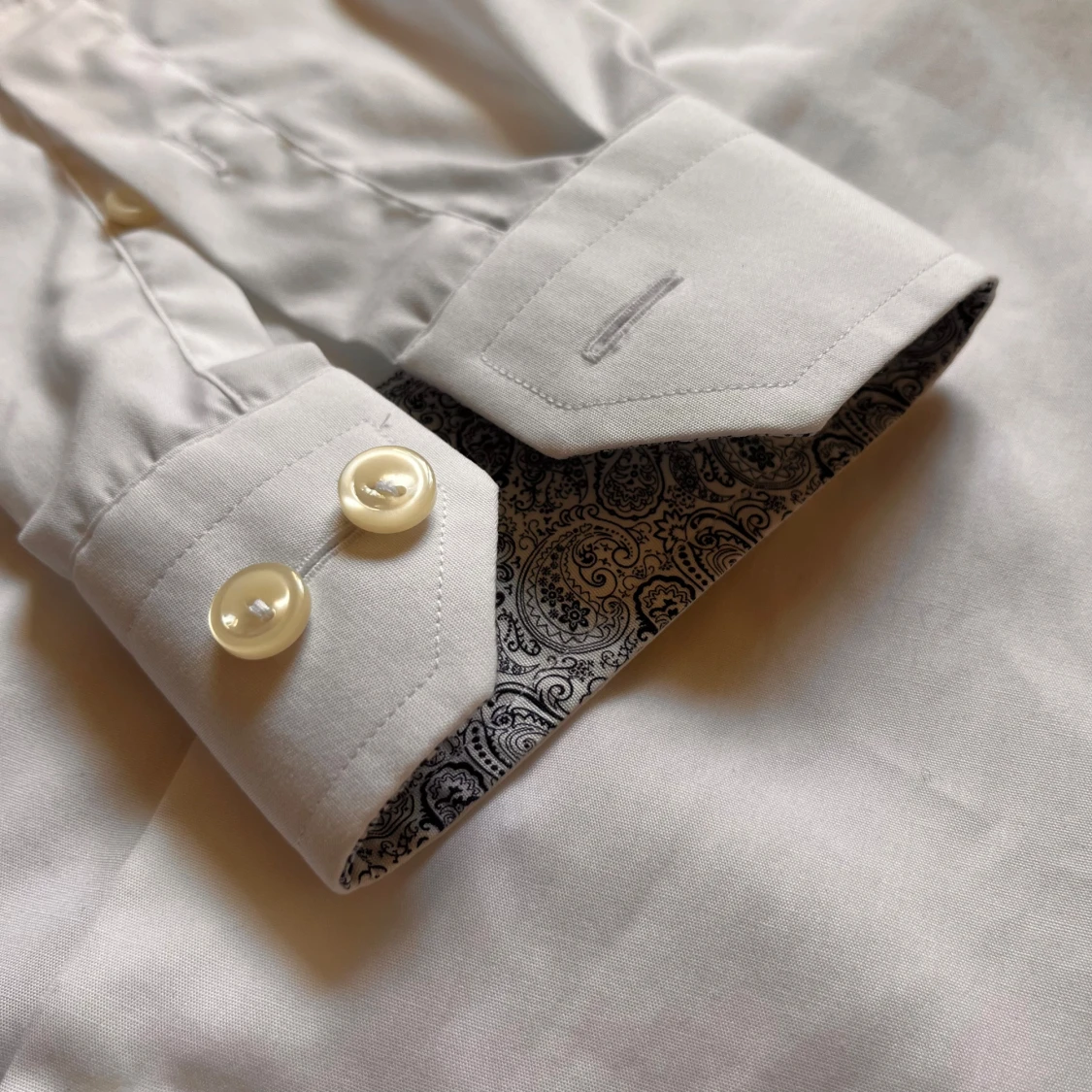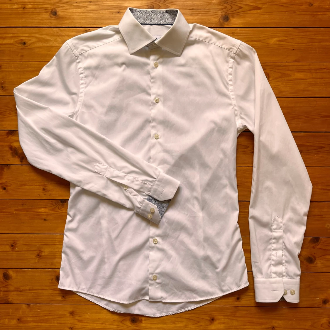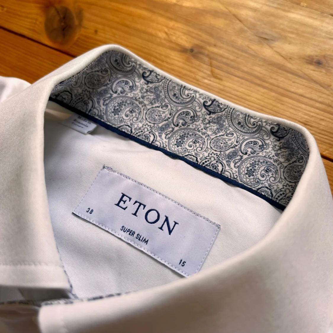 Snygg vit skjorta från Eton i super slim passform. Skjortan har långa ärmar, klassisk krage och coolt paisleymönstrat tyg på insidan av krage och manschetter. Tillverkad i mjuk bomull och stängs med vita knappar framtill.