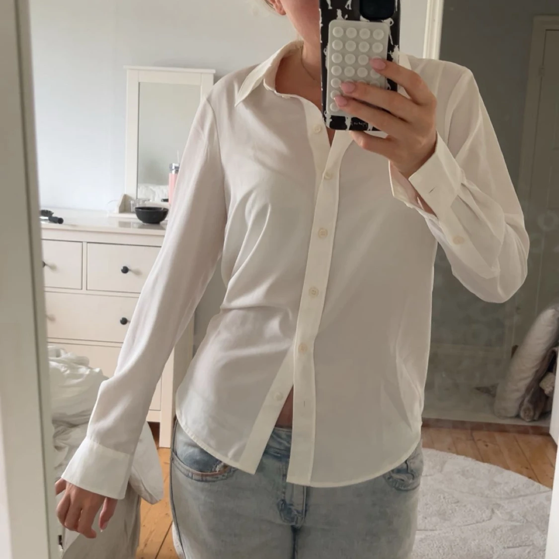 Säljer en stilren vit skjorta med klassisk krage och knäppning framtill. Skjortan har lång ärm och är tillverkad i ett tunt, mjukt material som känns skönt mot huden. Perfekt till jeans eller kostymbyxor. Säljer då jag inte andvänder !!!💓💓💓