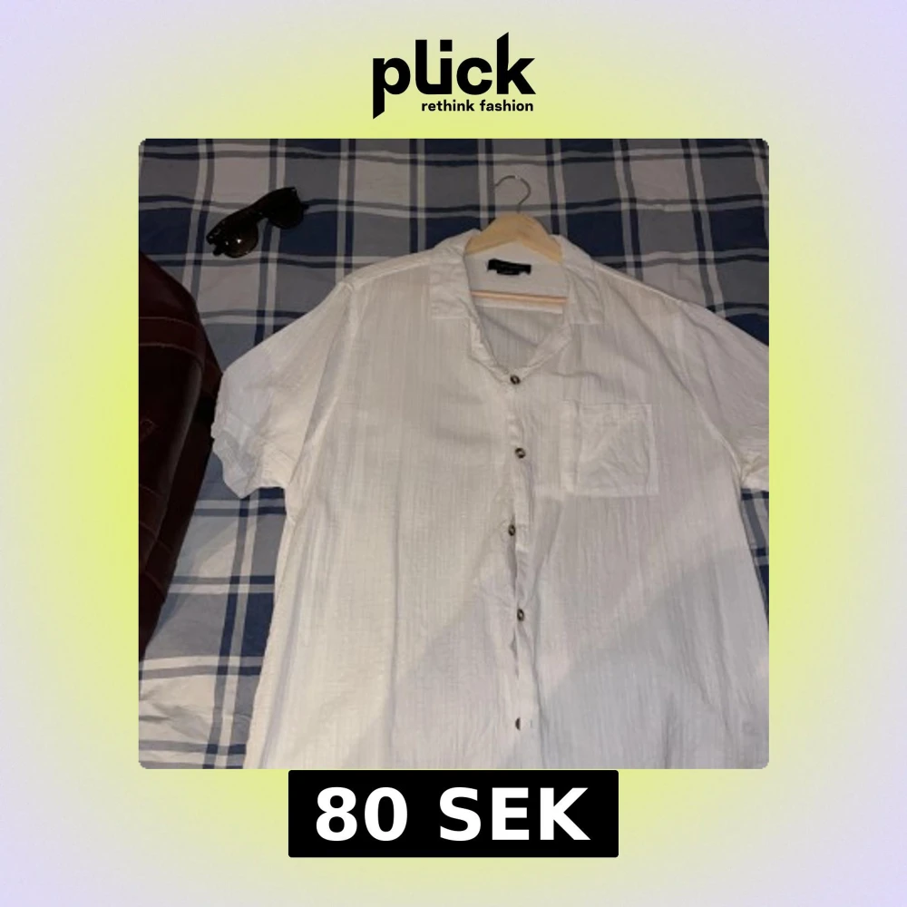 Säljer en stilren vit kortärmad skjorta med knappar framtill. Skjortan har en bröstficka och är perfekt för varma dagar. Passar bra till både jeans och shorts.
