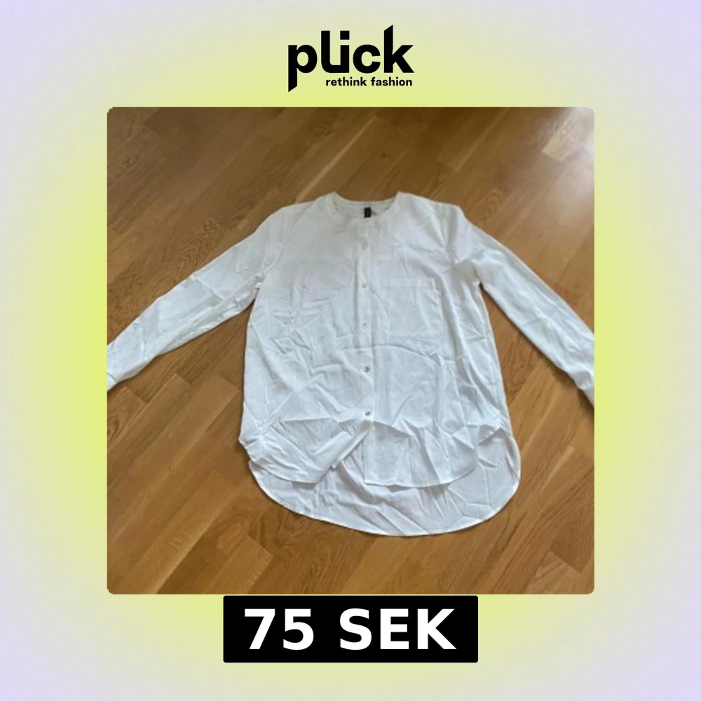 Säljer en stilren vit långärmad skjorta med knappar framtill. Skjortan har en klassisk design med rundad nederkant och är perfekt för en minimalistisk look. Har en liten smink fläck vid kragen