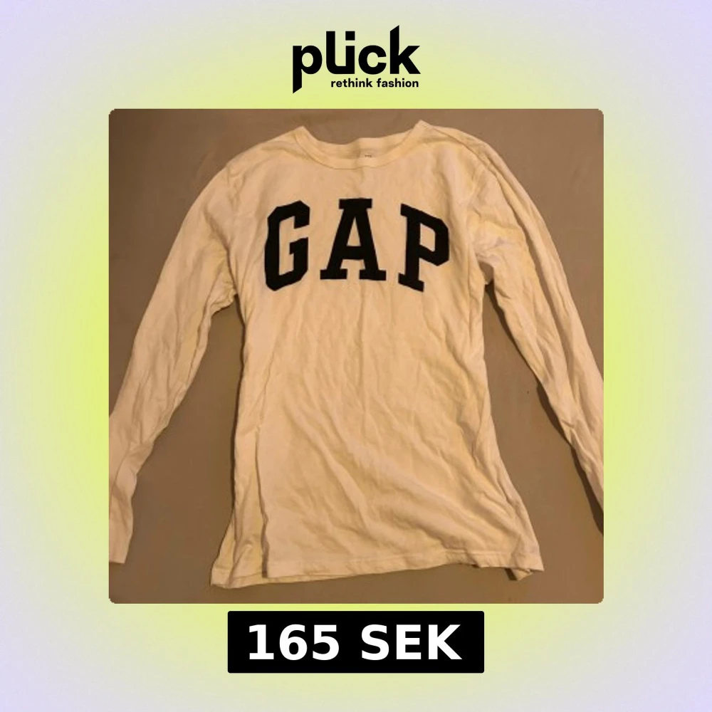 Säljer en klassisk vit långärmad tröja från GAP med svart logga på bröstet. Perfekt för en avslappnad stil och enkel att matcha med andra plagg.