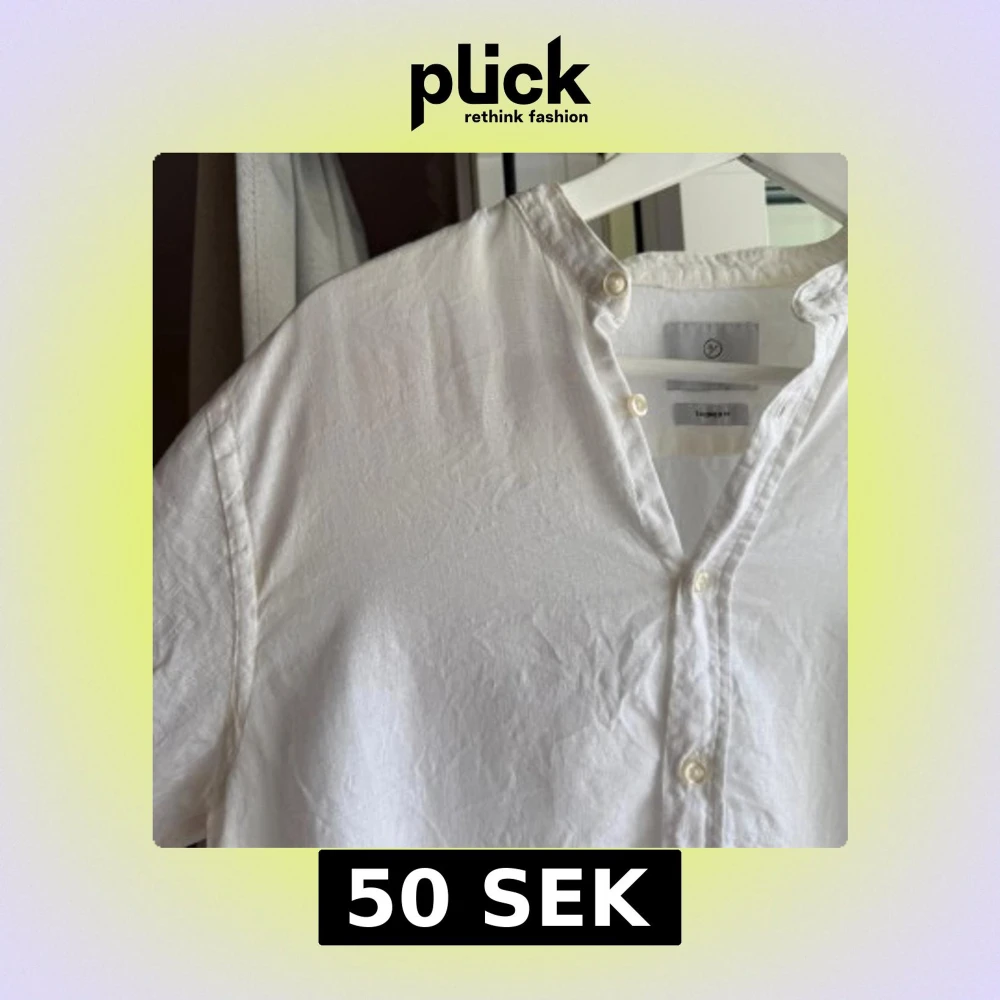 Fräsch vit linneskjorta från Bläck i storlek S. Långärmad skjorta med knappar hela vägen och ståkrage. Ganska genomskinlig, tunn och härlig d.v.s sval och luftig. Något liten i storlek. Den är lite missfärgad efter solkräm men jag har tvättat den ordentligt.