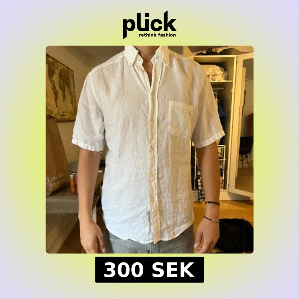 Säljer en fräsch vit skjorta från Eton i linnematerial. Skjortan har korta ärmar, bröstficka och klassisk krage. Passformen är slim och den stängs med knappar framtill.