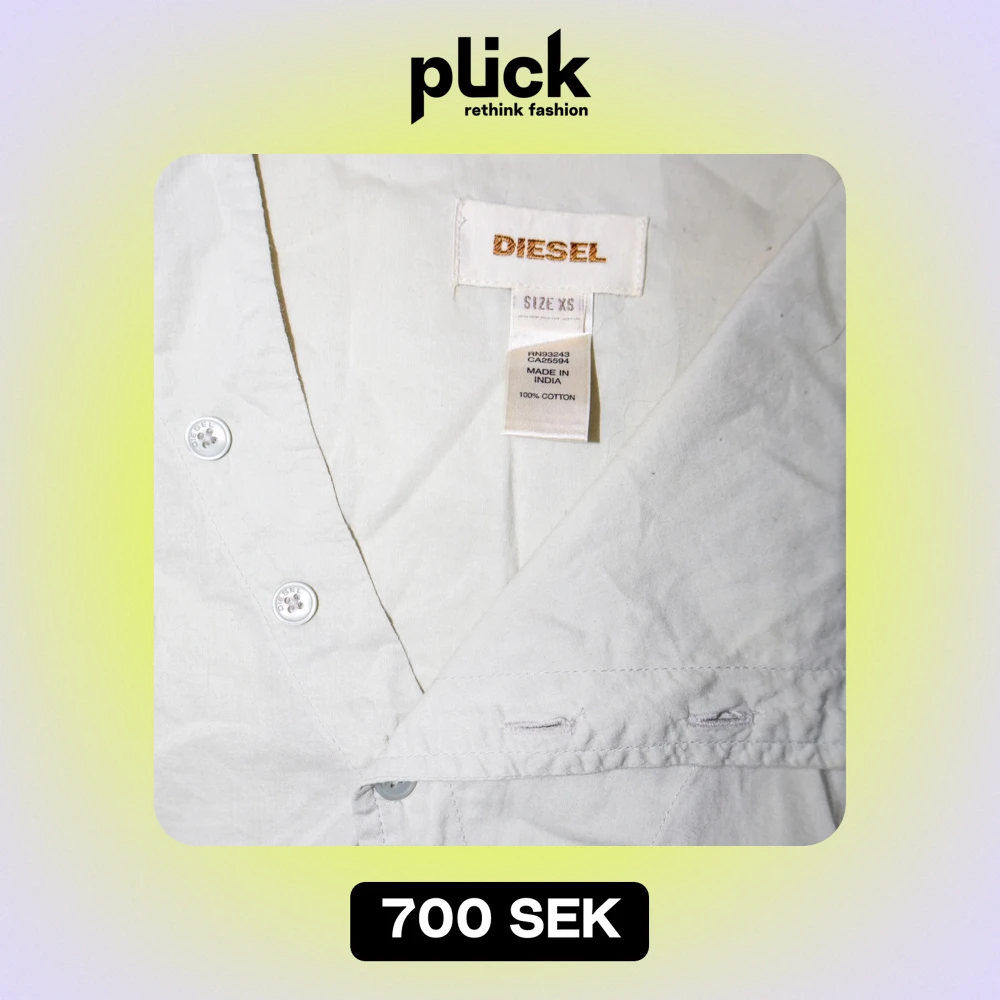 Säljer en stilren vit/ ljusgrå skjorta från Diesel i storlek XS. Skjortan är tillverkad i 100% bomull och har en unik asymmetrisk knäppning framtill. Den har långa ärmar och en hög krage, perfekt för både vardag och fest. Skjortan är i mycket bra skick och redo för nya äventyr!