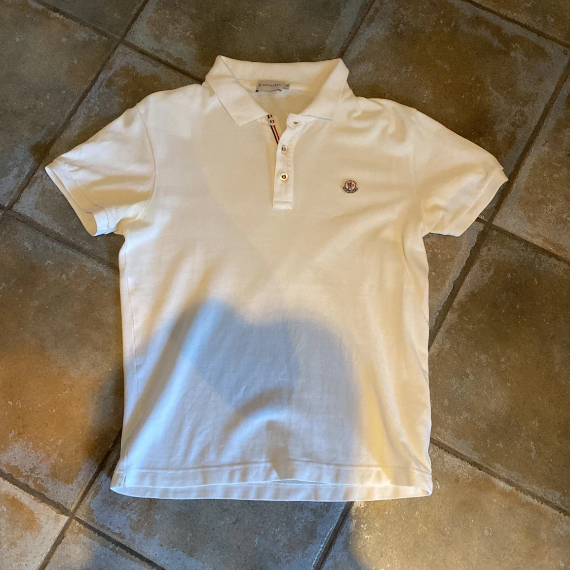 Vit pikétröja från Moncler med klassisk krage, knappar framtill och Moncler-logga på bröstet. Tricolore-detalj vid knappslån ger en snygg touch. Tillverkad i mjuk bomull och har korta ärmar för en clean och stilren look.
