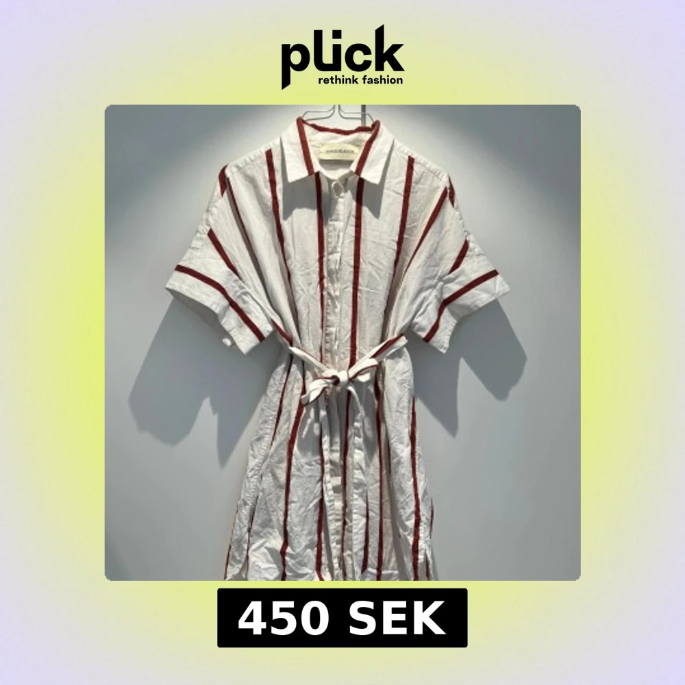 Snygg vit skjorta med röda ränder från By Malene Birger. Den har korta ärmar och en klassisk krage. Skjortan kommer med ett knytband i midjan för en fin passform.