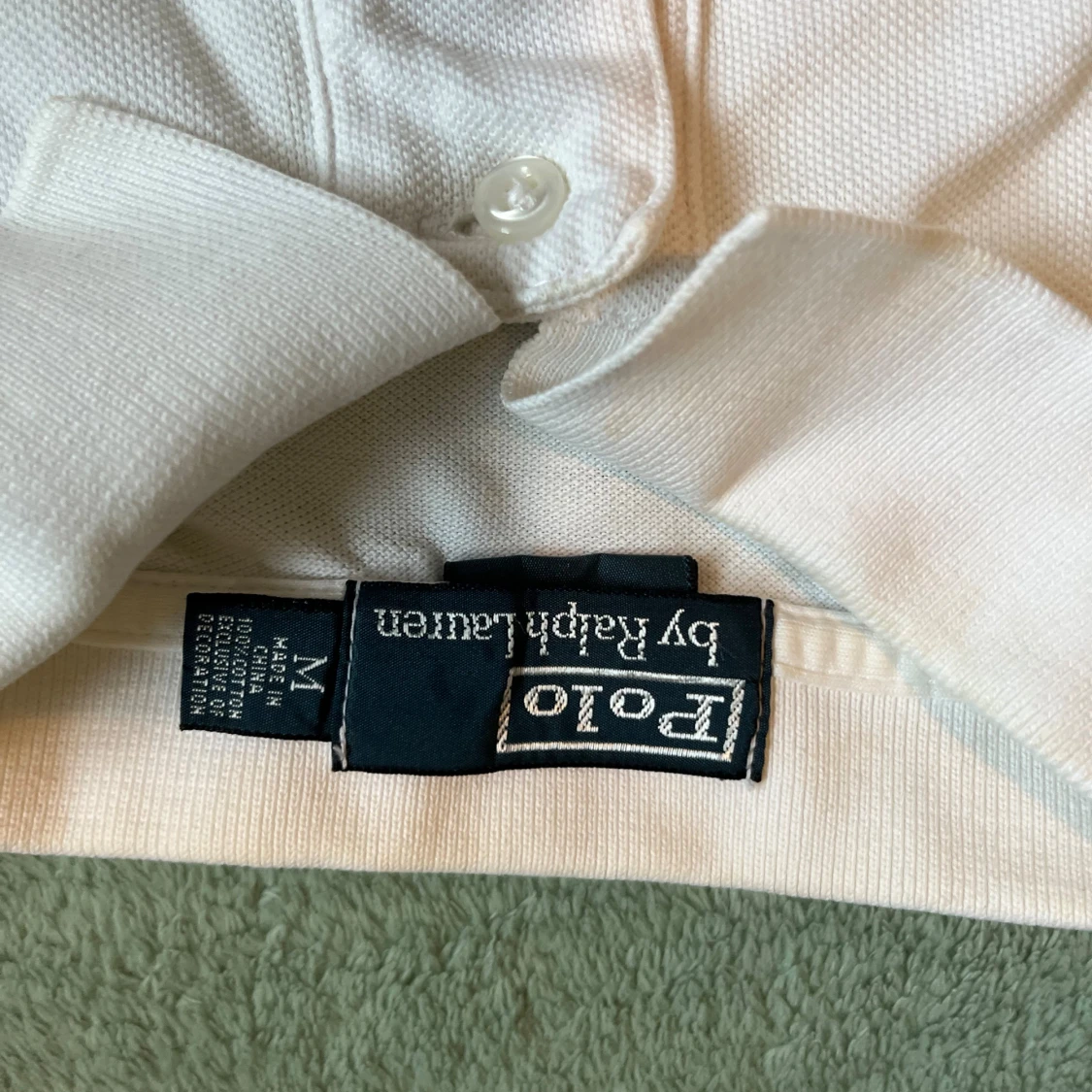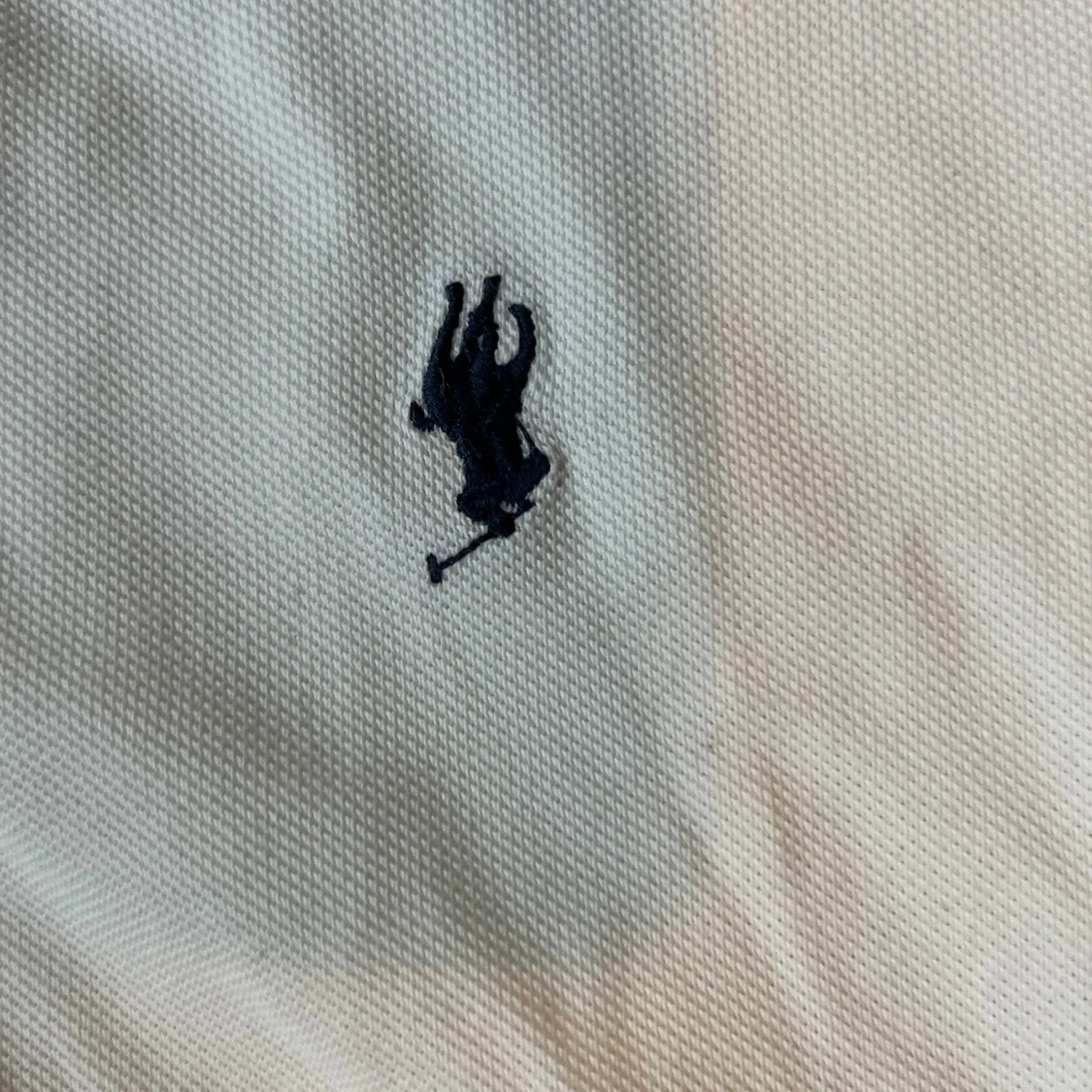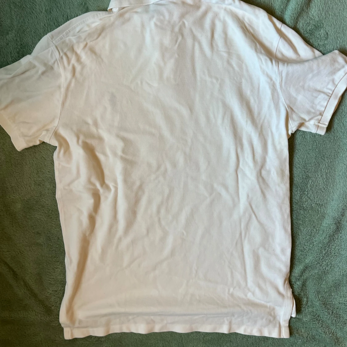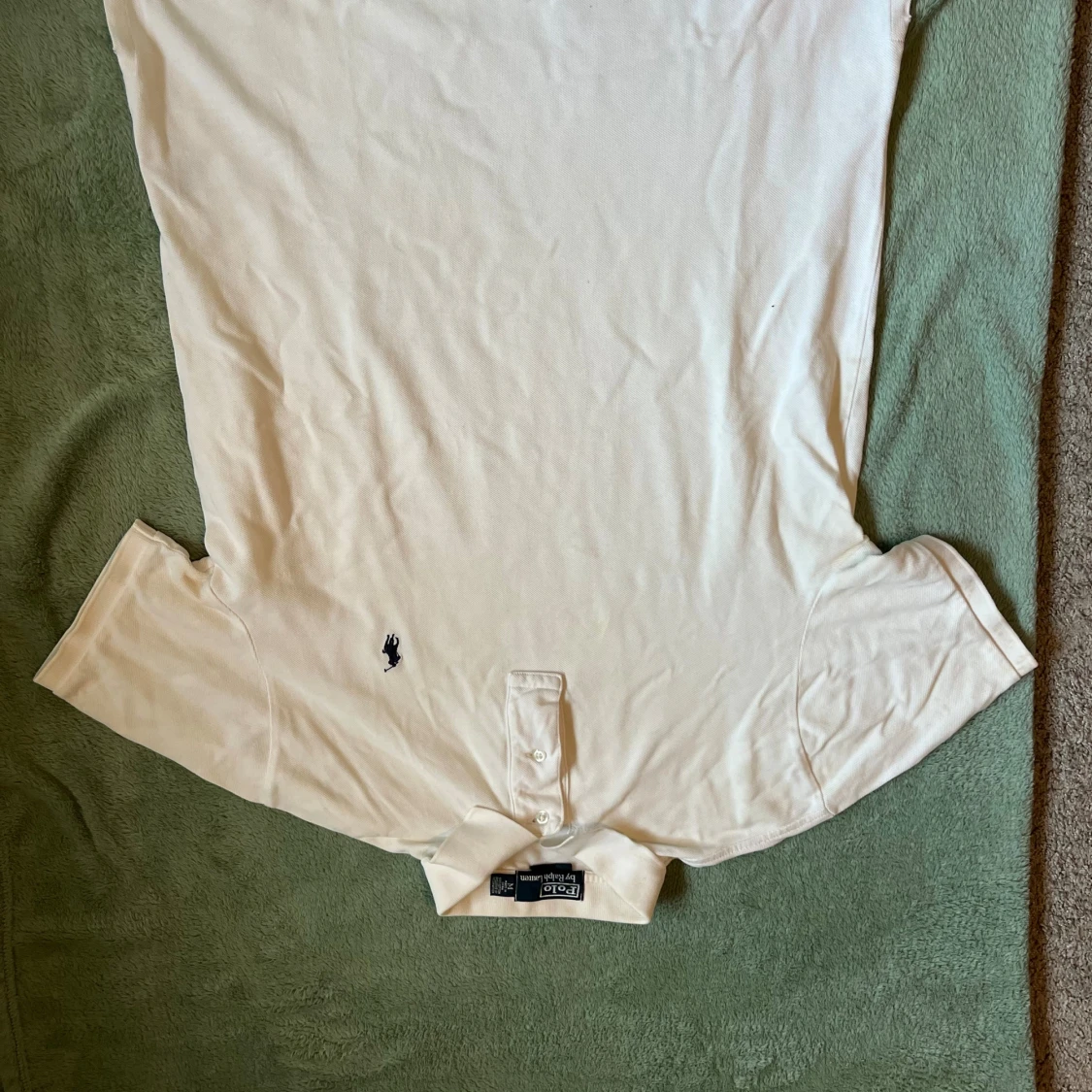 Vit pikétröja från Polo Ralph Lauren med klassisk krage, två knappar och den ikoniska broderade polospelaren på bröstet. Tröjan är i bomull och har korta ärmar. Perfekt för en clean och stilren look.