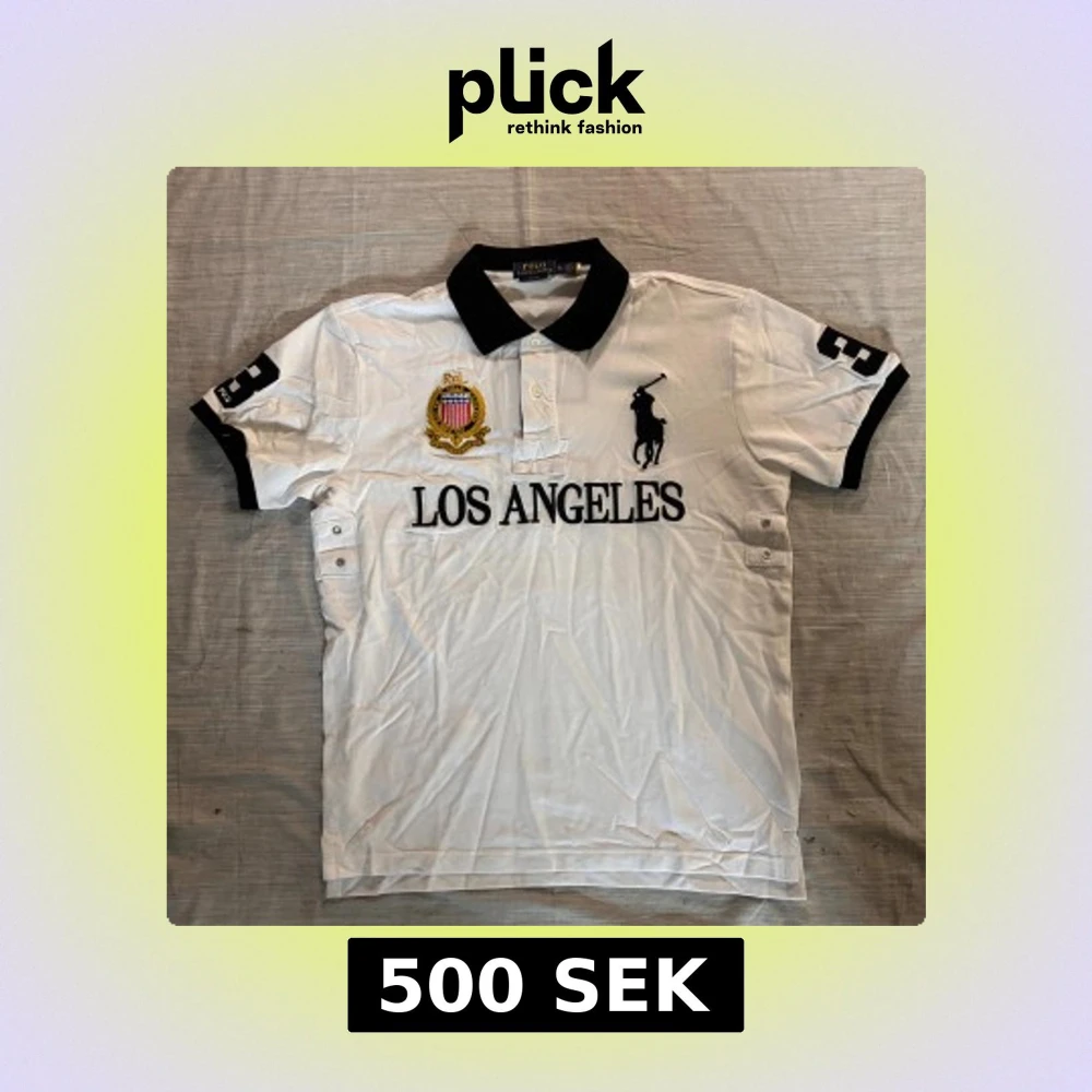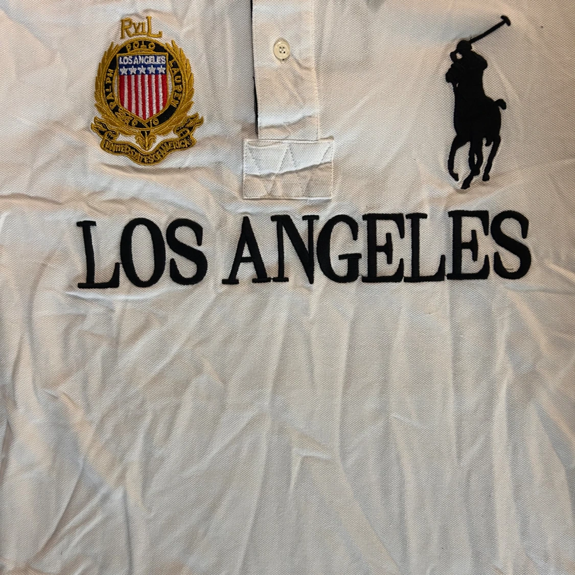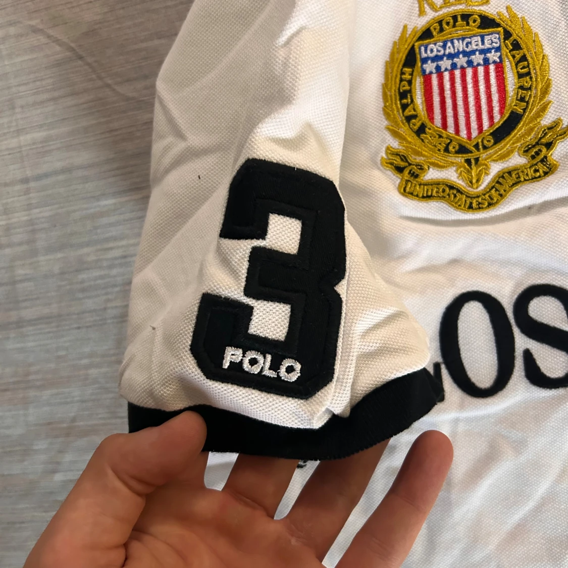 Vit pikétröja från Polo Ralph Lauren med svart krage och detaljer. Broderad Los Angeles-text, stort polospelare-logo och emblem på bröstet samt siffra 3 på ärmen. Klassisk och sportig look, perfekt för dig som gillar streetstyle.