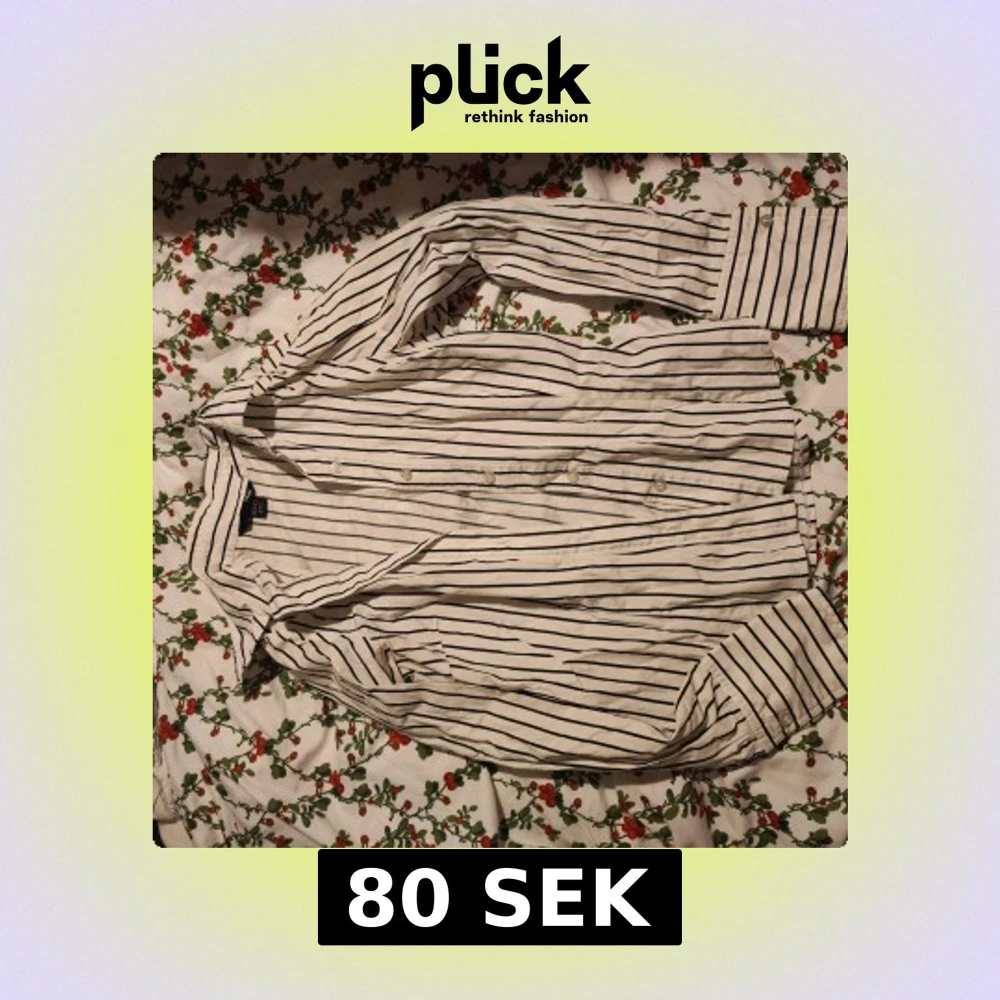 Vit skjorta från H&M med svarta tunna ränder. Klassisk krage, långa ärmar och knäppning framtill med vita knappar. Tillverkad i mjuk bomull, perfekt för en clean och stilren look.