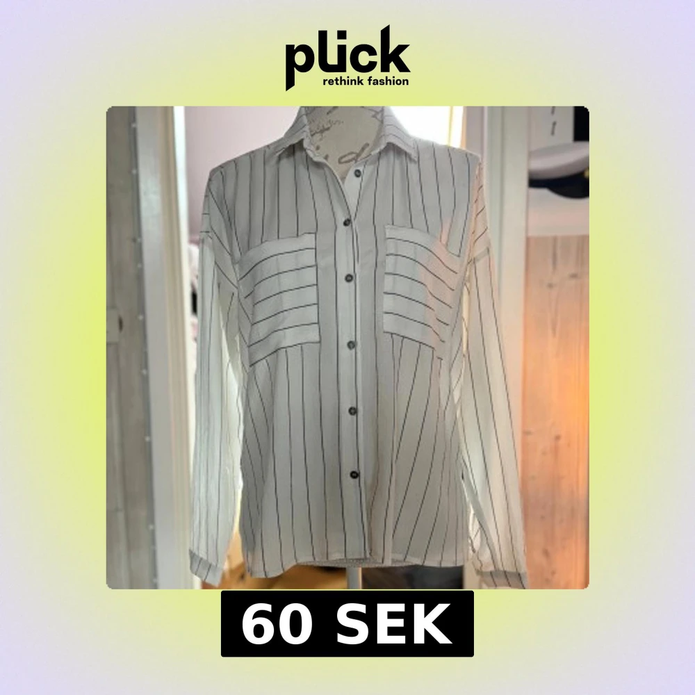 Säljer en vit skjorta från Rut&Circle i storlek 36 med svarta tunna ränder. Skjortan har två bröstfickor, knappar framtill och klassisk krage. Långärmad och i ett lätt, luftigt material som känns skönt mot huden.