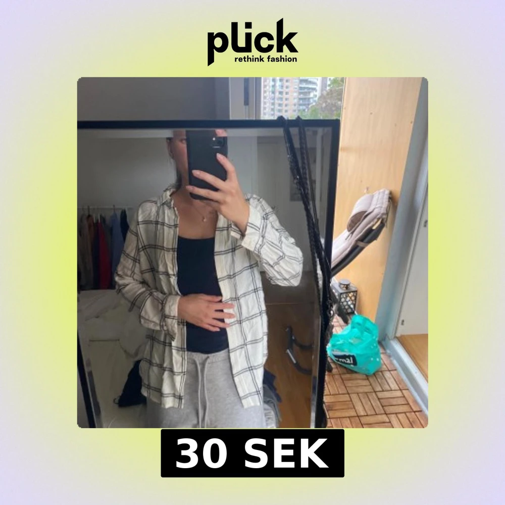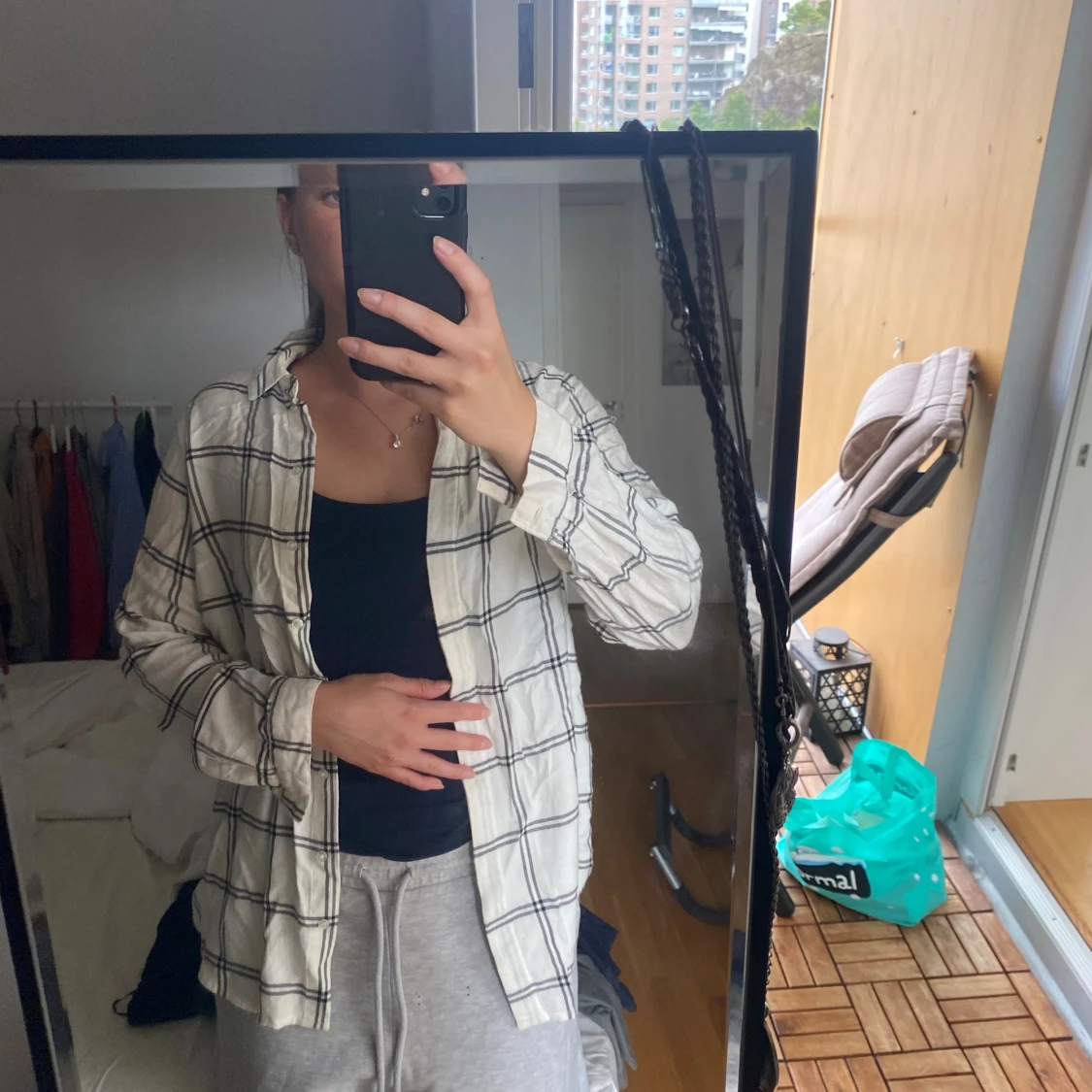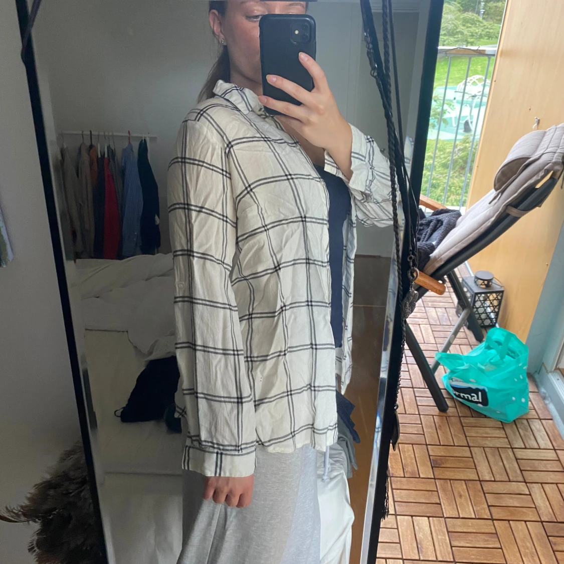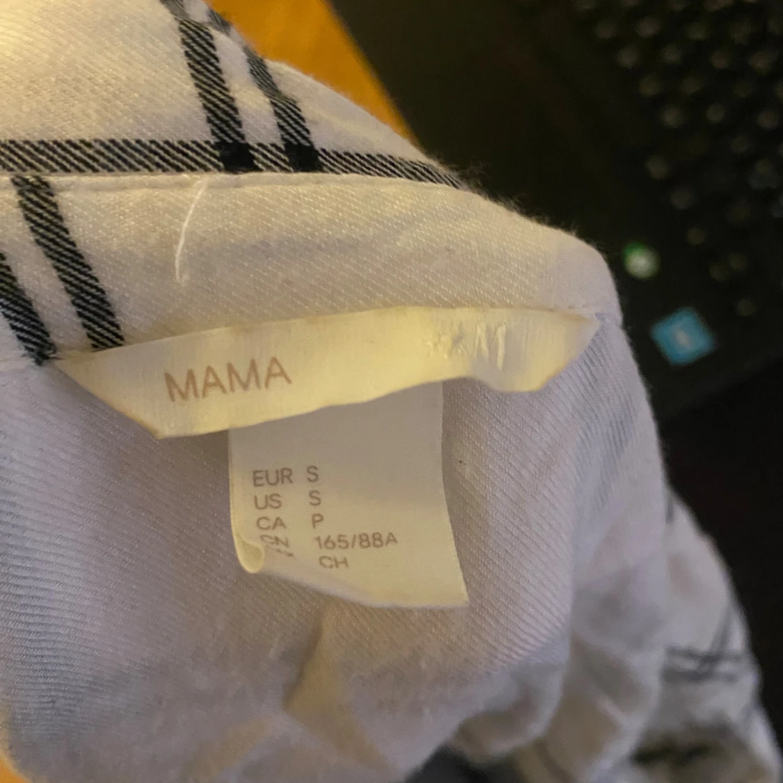 Vit skjorta med svart rutigt mönster från H&M MAMA. Skjortan har klassisk krage, långa ärmar och knappar framtill. Tillverkad i mjuk bomull, perfekt för en chill och avslappnad stil.