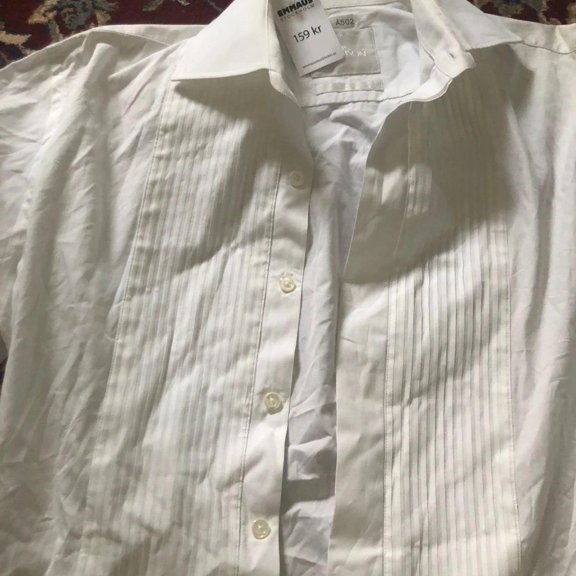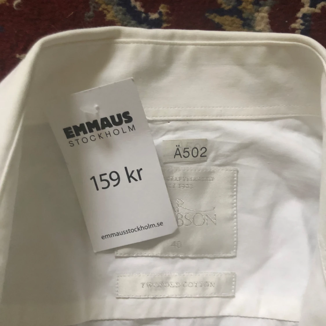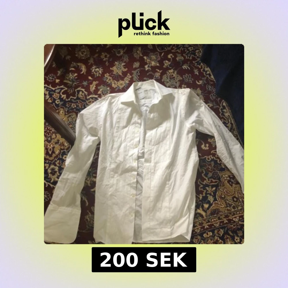 Snygg vit skjorta köpt från Emmaus i stockholm med klassisk krage och knappar framtill. Skjortan har ett diskret randigt mönster och är perfekt för en stilren look. Tillverkad i bomull för en bekväm känsla. Endast testad ej använd, sitter som s/m