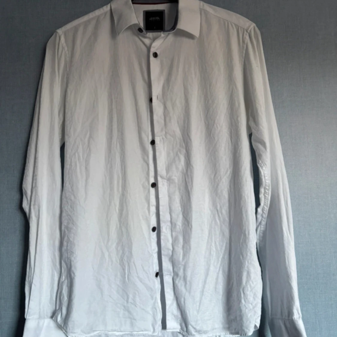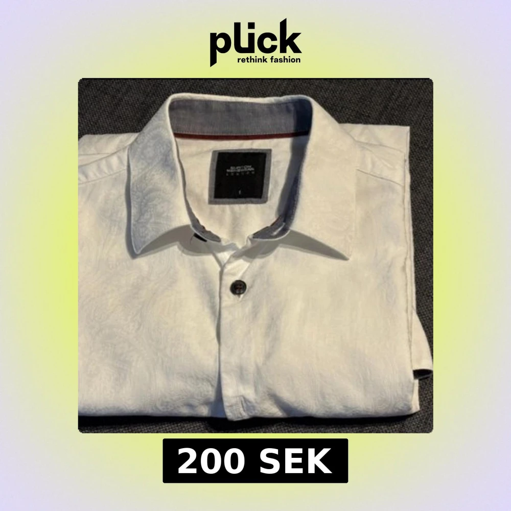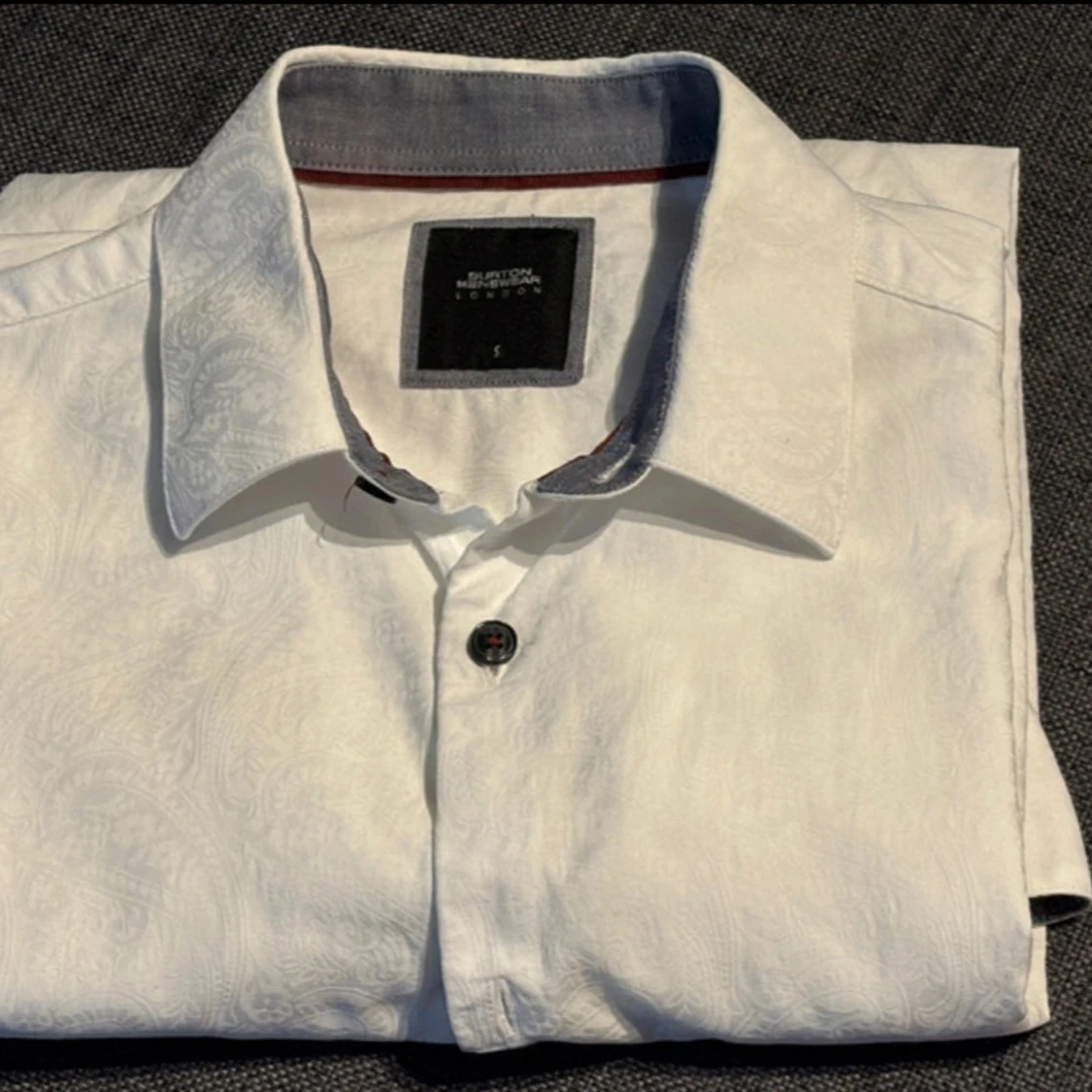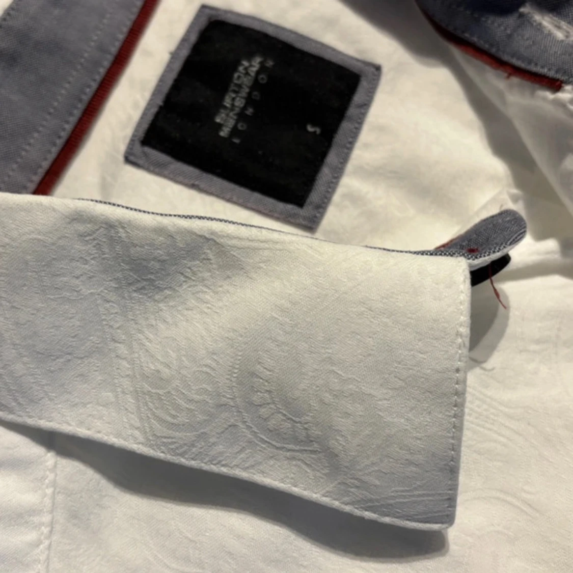 Vit skjorta från Burton London med diskret paisleymönster i tyget. Klassisk krage, svarta knappar och kontrastfärgad insida på kragen. Långärmad och tillverkad i bomull, perfekt för en clean och stilren look.