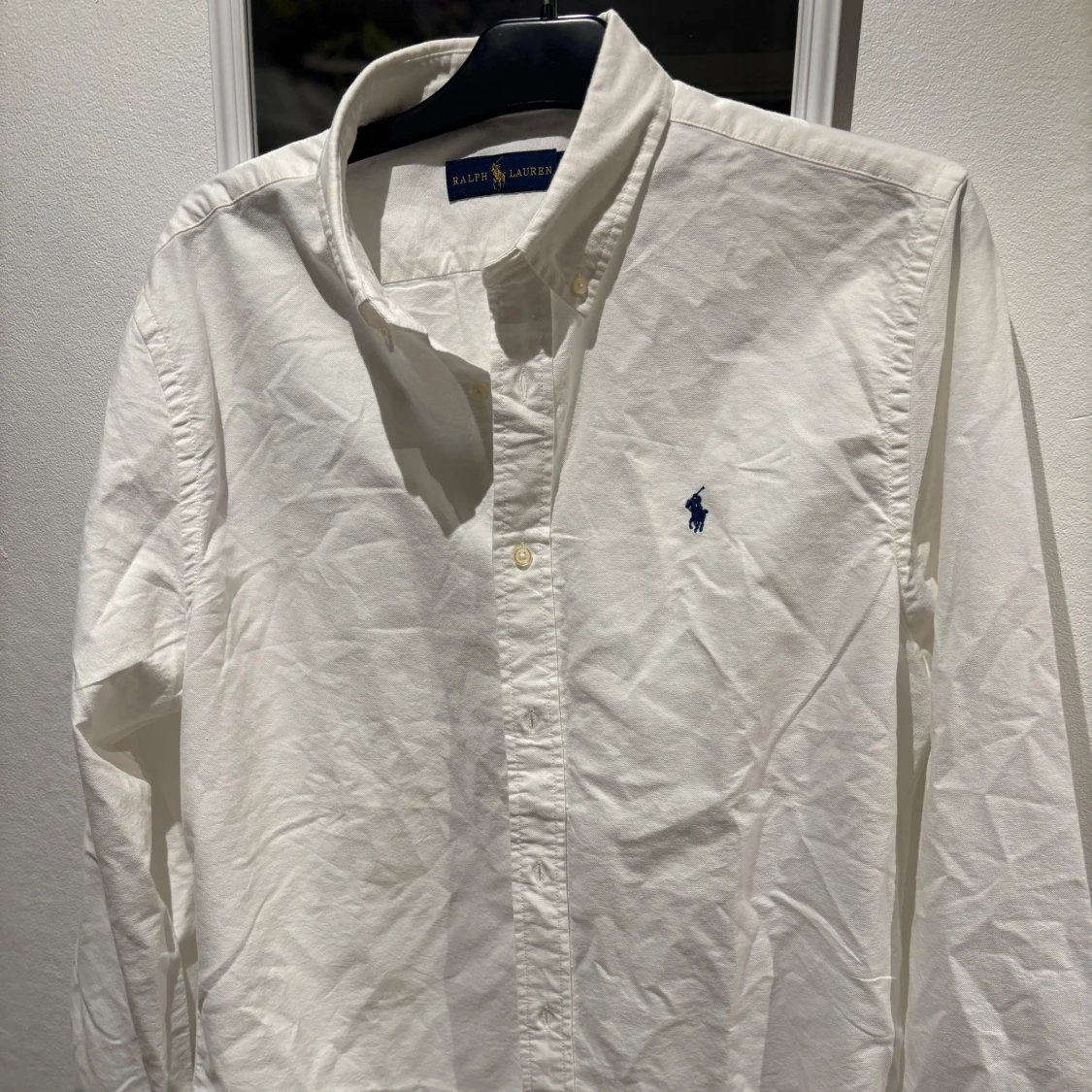 Klassisk vit skjorta från Ralph Lauren med broderad blå logga på bröstet. Skjortan har lång ärm, knappar framtill och en stilren krage. Perfekt för dig som gillar en clean och tidlös look.för fler frågor eller bilder är de bara att skriva!
