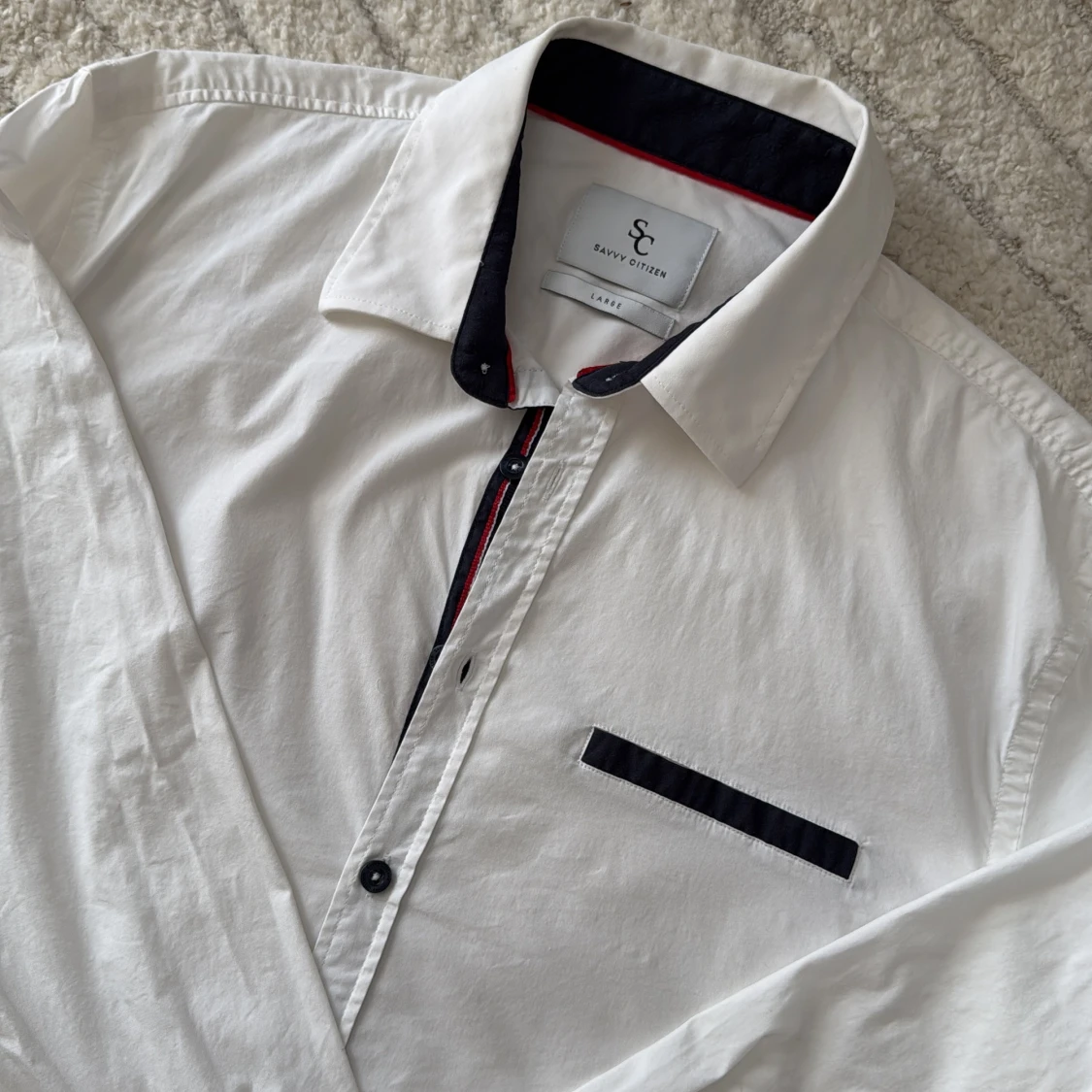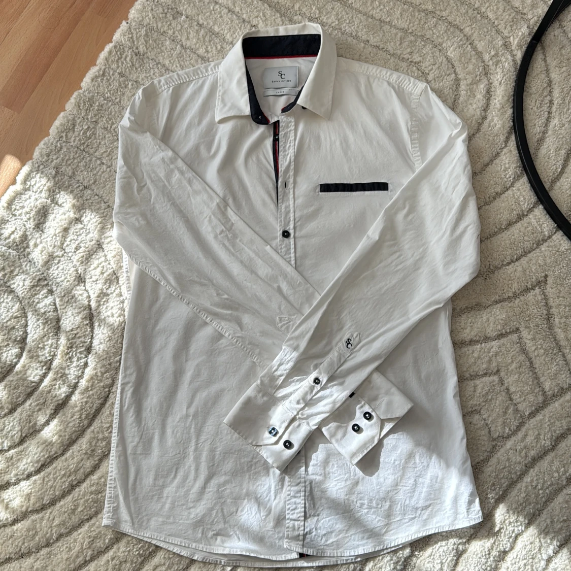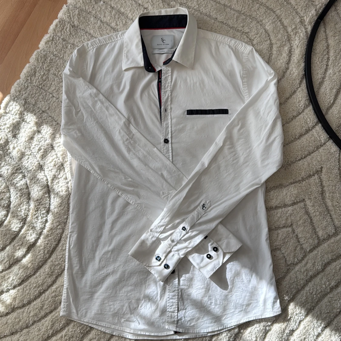 Vit skjorta från Savvy Citizen i storlek L. Skjortan har svarta detaljer på krage, knappslå och bröstficka samt svarta knappar. Tillverkad i bomull och har lång ärm med dubbla knappar vid manschetten. Snygg kontrast med röd linje på insidan av kragen.
