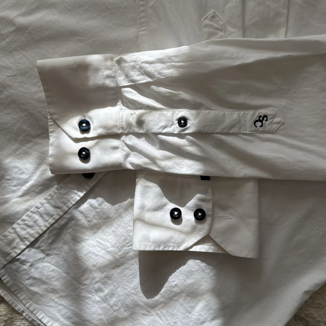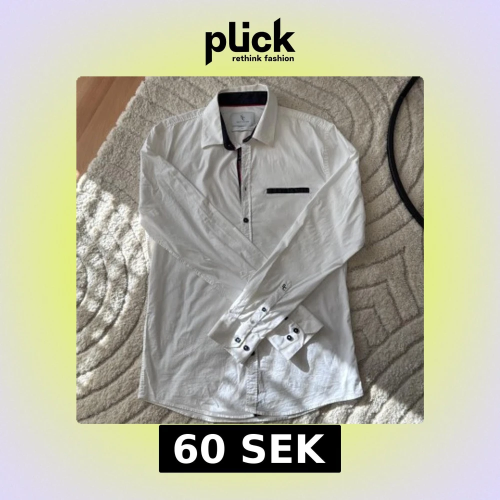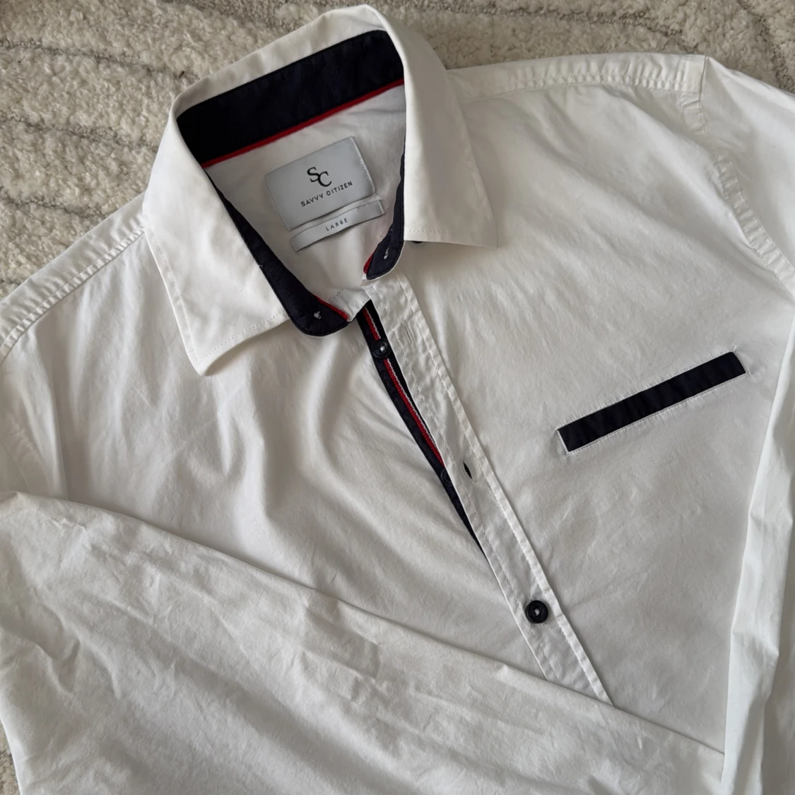 Vit skjorta från Savvy Citizen i storlek L. Skjortan har svarta detaljer på krage, knappslå och bröstficka samt svarta knappar. Tillverkad i bomull och har lång ärm med dubbla knappar vid manschetten. Snygg kontrast med röd linje på insidan av kragen.