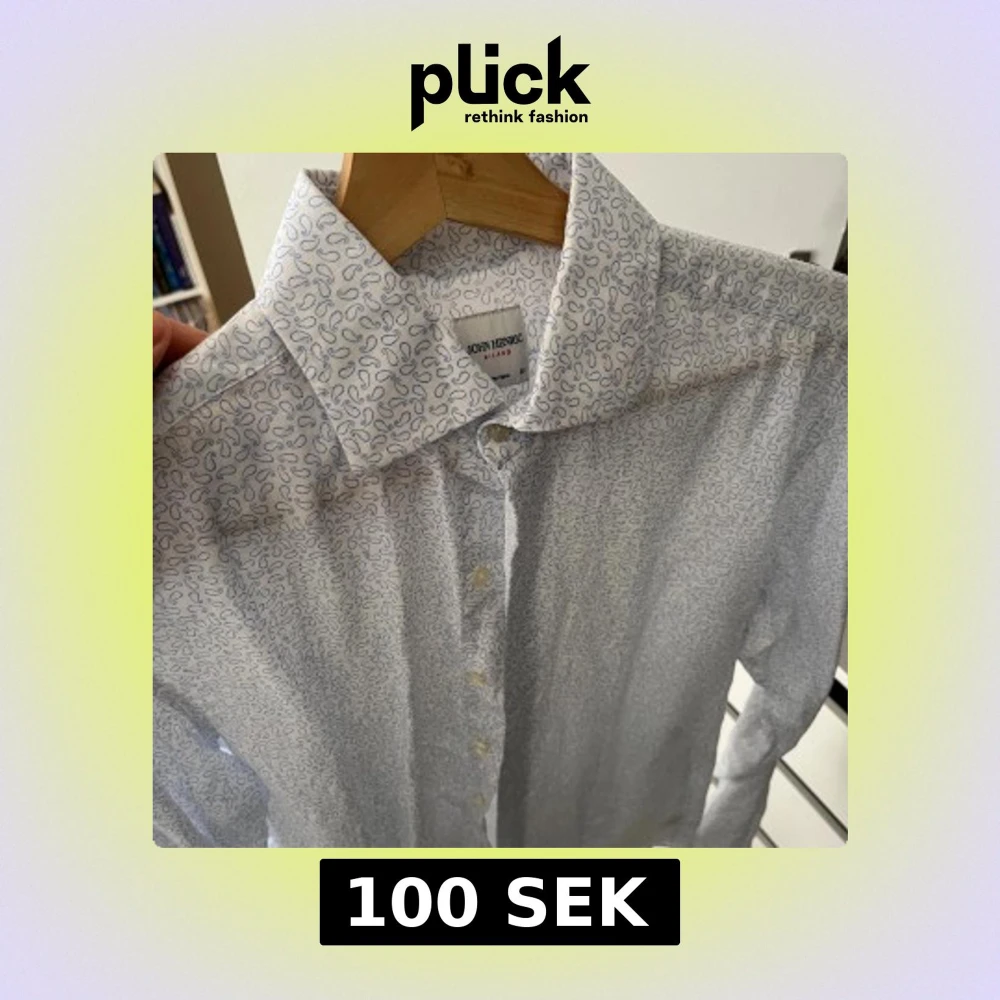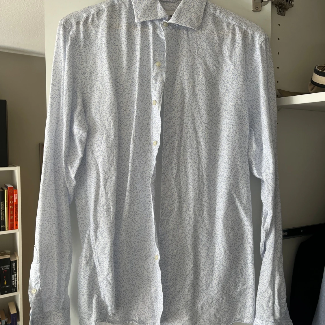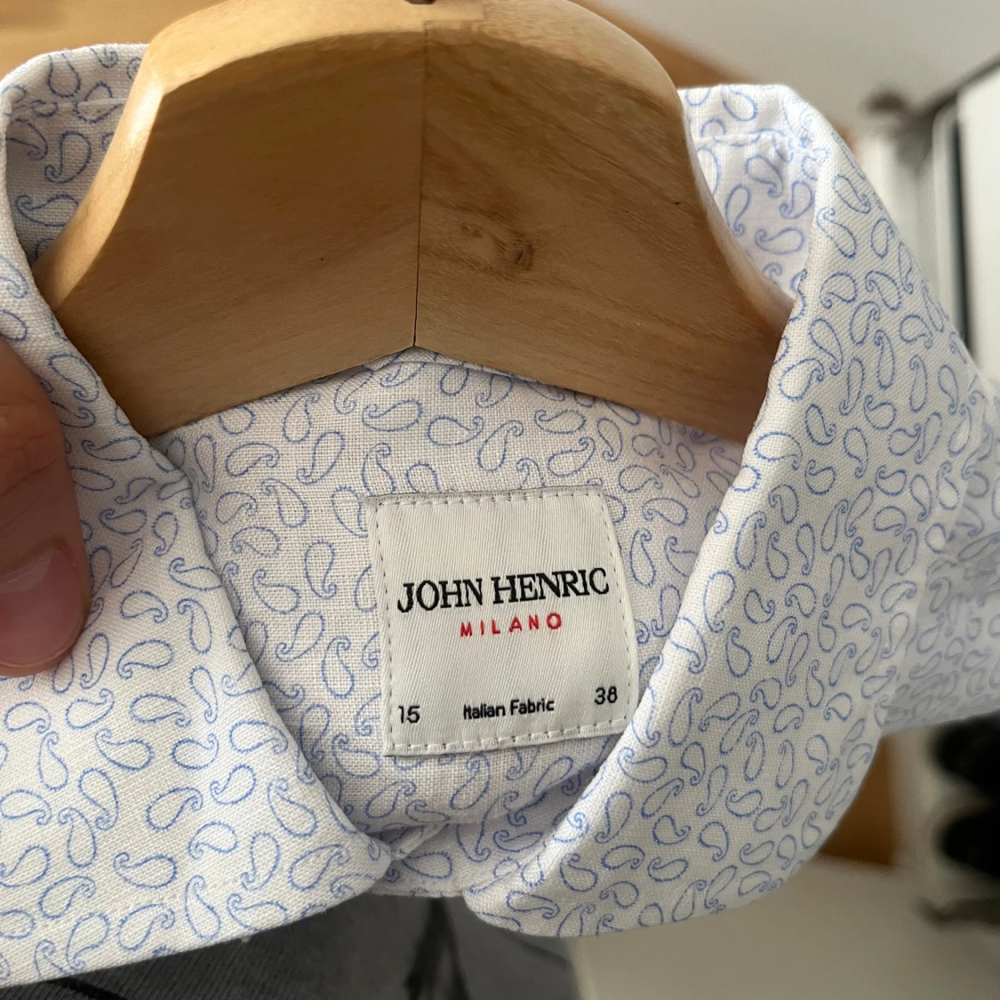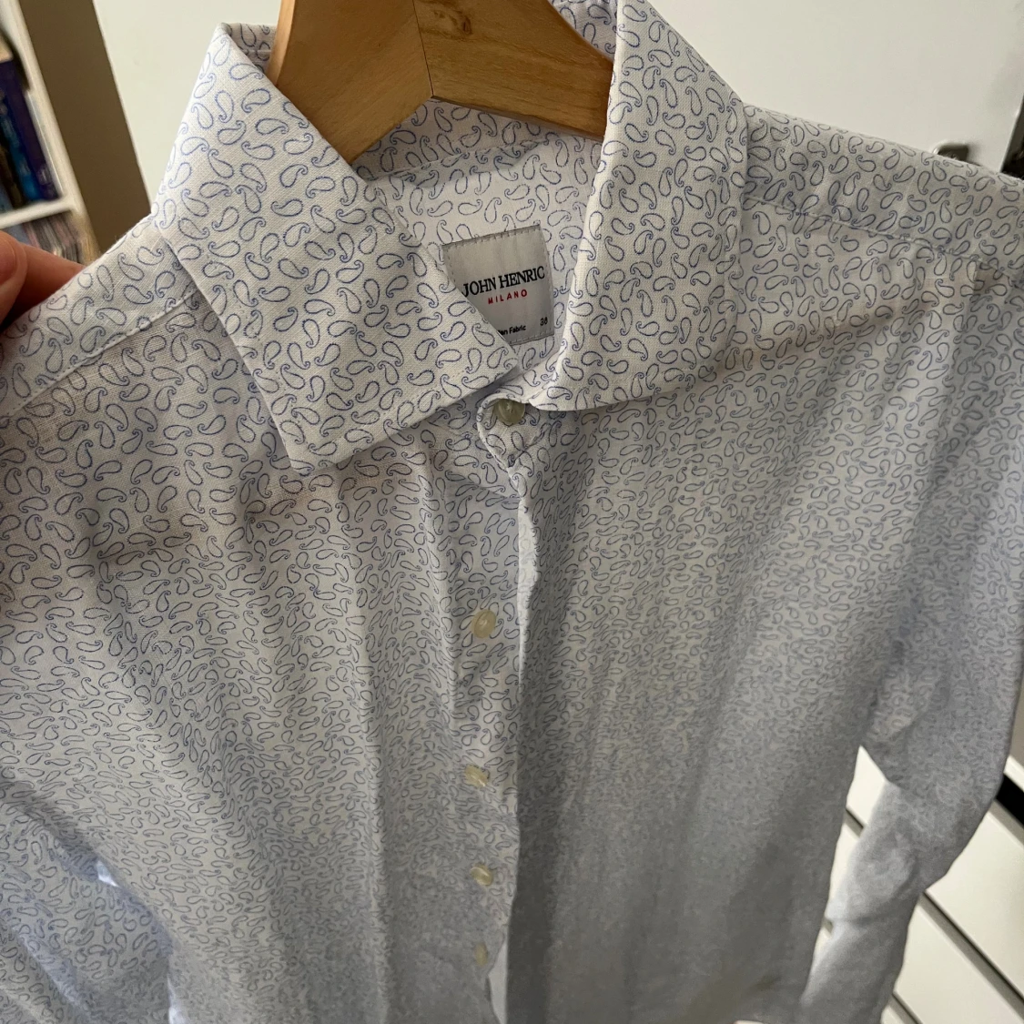 Snygg vit skjorta från John Henric med ljusblå mönster. Size 38, vilket motsvarar Small. Tillverkad i italienskt bomullstyg som känns mjukt och fräscht mot huden. Perfekt för dig som gillar stilrena detaljer.