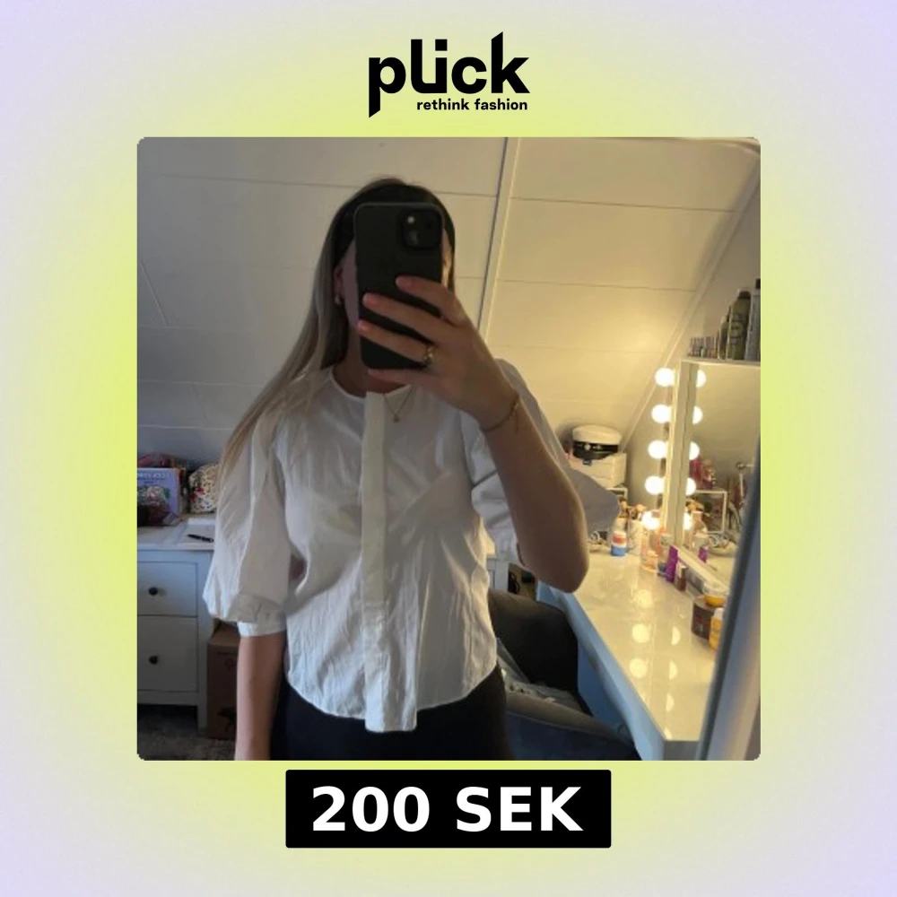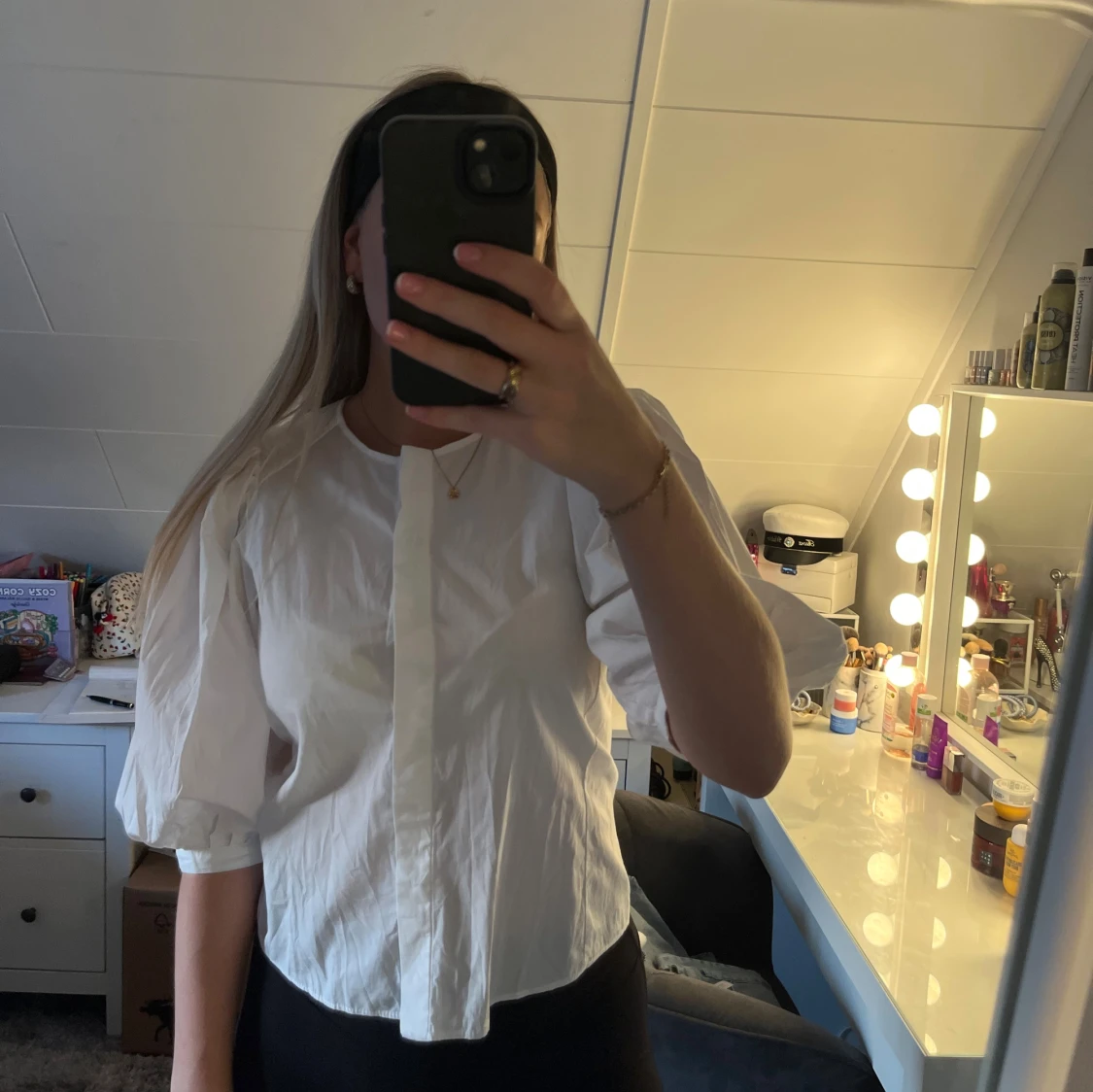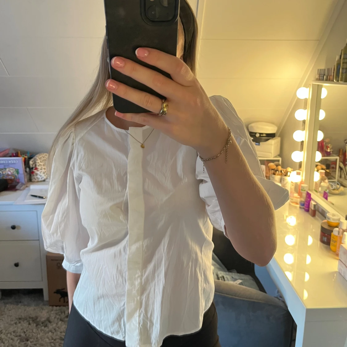 Säljer en vit skjorta med puffiga trekvartsärmar och dold knappslå framtill.
