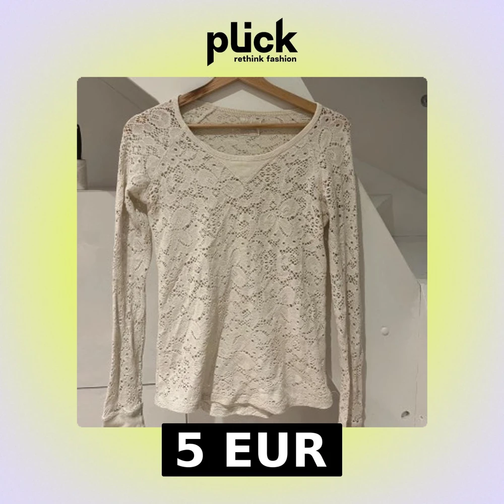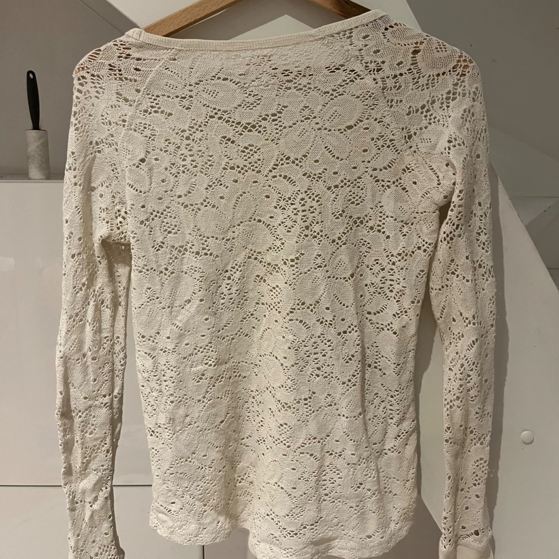 Superfin vit blus i spets med lång ärm och rund halsringning. Blusen har ett vackert blommigt hålmönster över hela plagget och är lätt transparent.