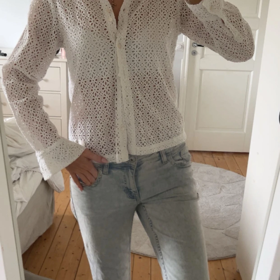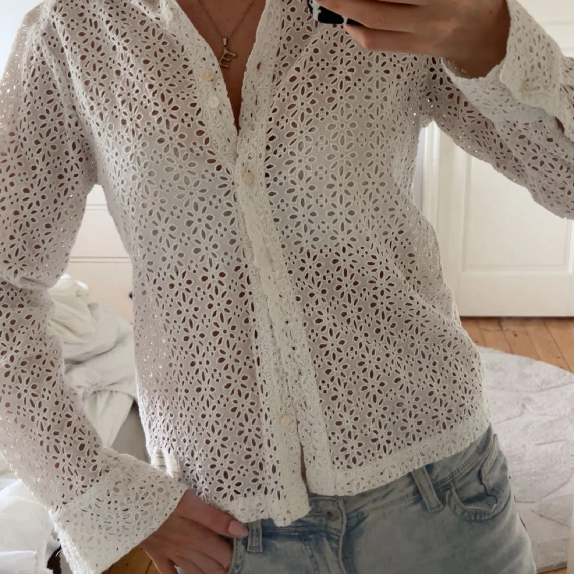 Superfin vit skjorta i spetsmönster med blommiga broderier och knappar framtill. Jättesnygg på sommaren!! Aldrig Andvänd 💓