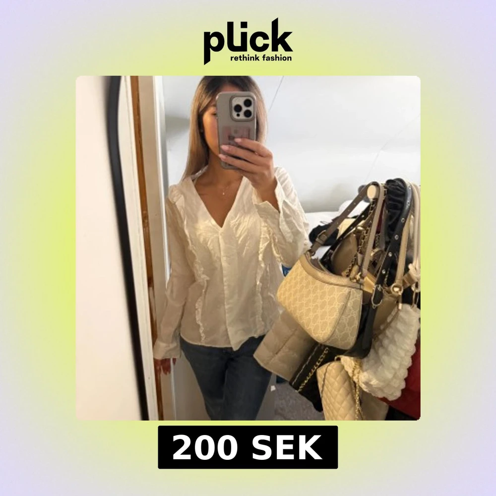 Säljer en vit skjorta med v-ringning och snygga volangdetaljer längs framsidan. Skjortan har långa ärmar och knappar framtill. Perfekt för dig som gillar en feminin och trendig look. Materialet känns lätt och luftigt. Står ingen storlek men passa mig som bruka ha s