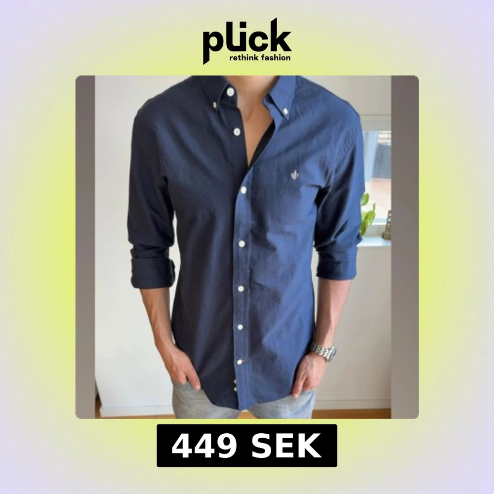 Säljer en stilren mörkblå skjorta (knappast använd) från Morris med vit broderad logga på bröstet. Skjortan har klassisk krage, vita knappar och lång ärm. Perfekt för dig som gillar en clean och tidlös look. Den är i M 39/40.