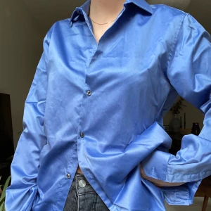 En snygg blå skjorta i lite glansigt material! Bra skick, köparen står för frakt 63kr 💞