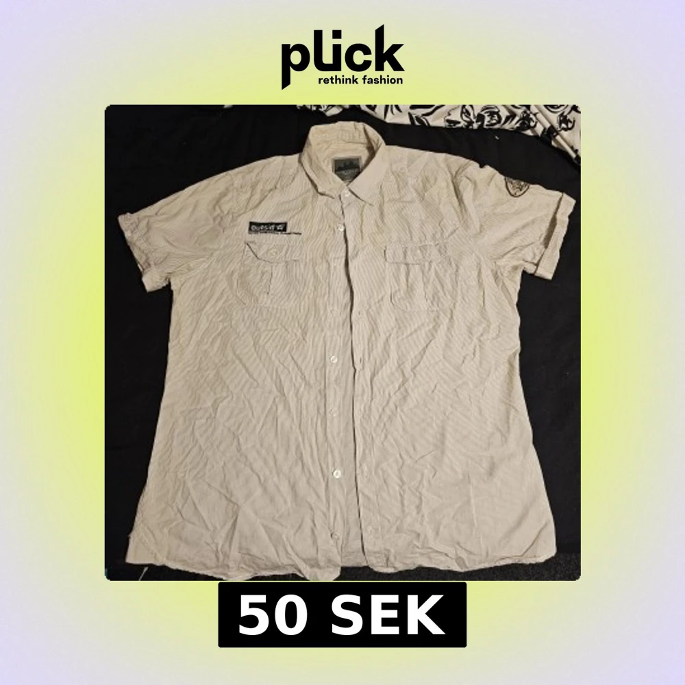 Beige kortärmad skjorta med diskreta smala ränder, två bröstfickor med lock och knappar framtill. Skjortan har patch på ärmen och broderad logga på bröstet. Perfekt för en avslappnad och cool stil.