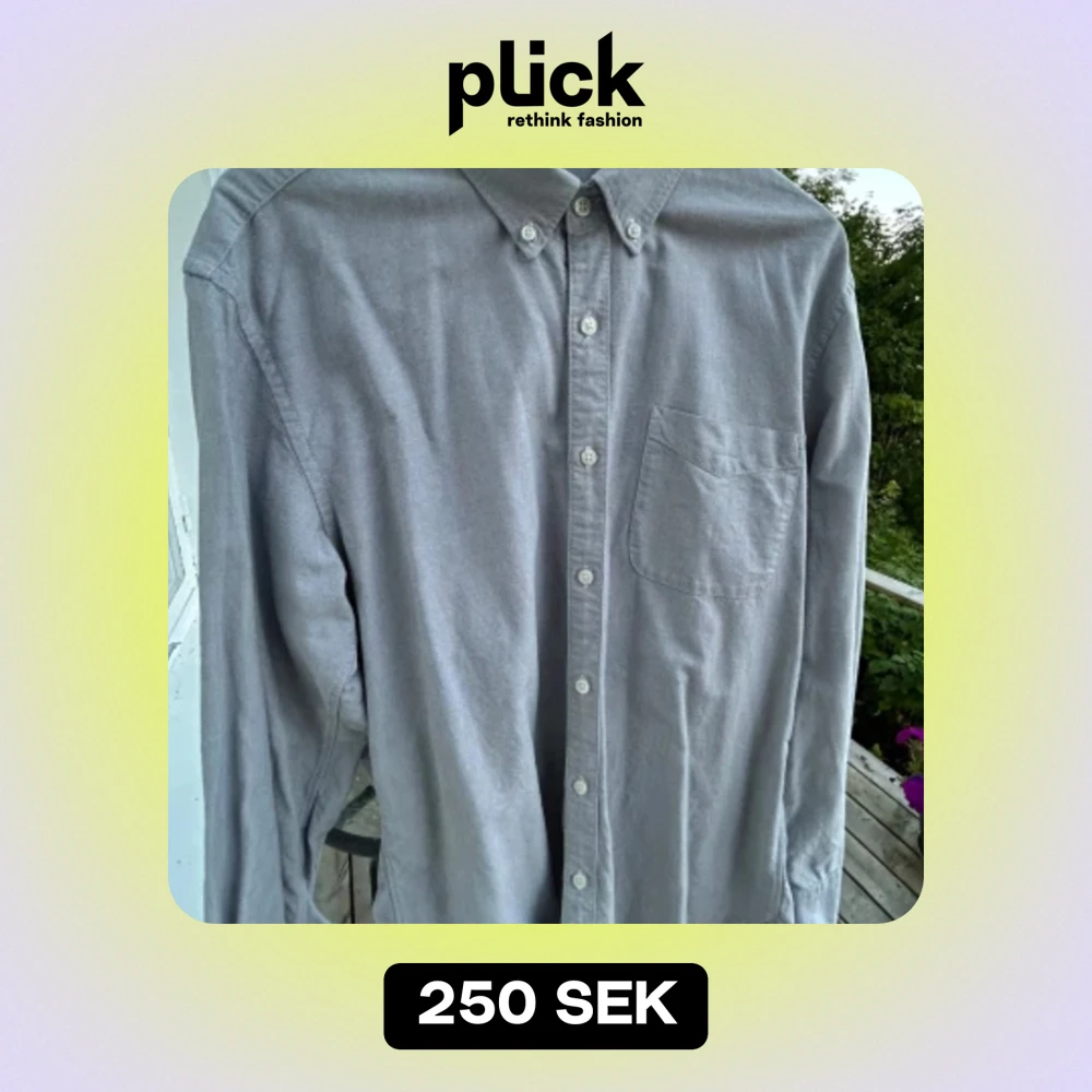 Säljer en stilren grå långärmad skjorta med knappar hela vägen ner och en bröstficka. Skjortan har en klassisk krage och är i bra skick.