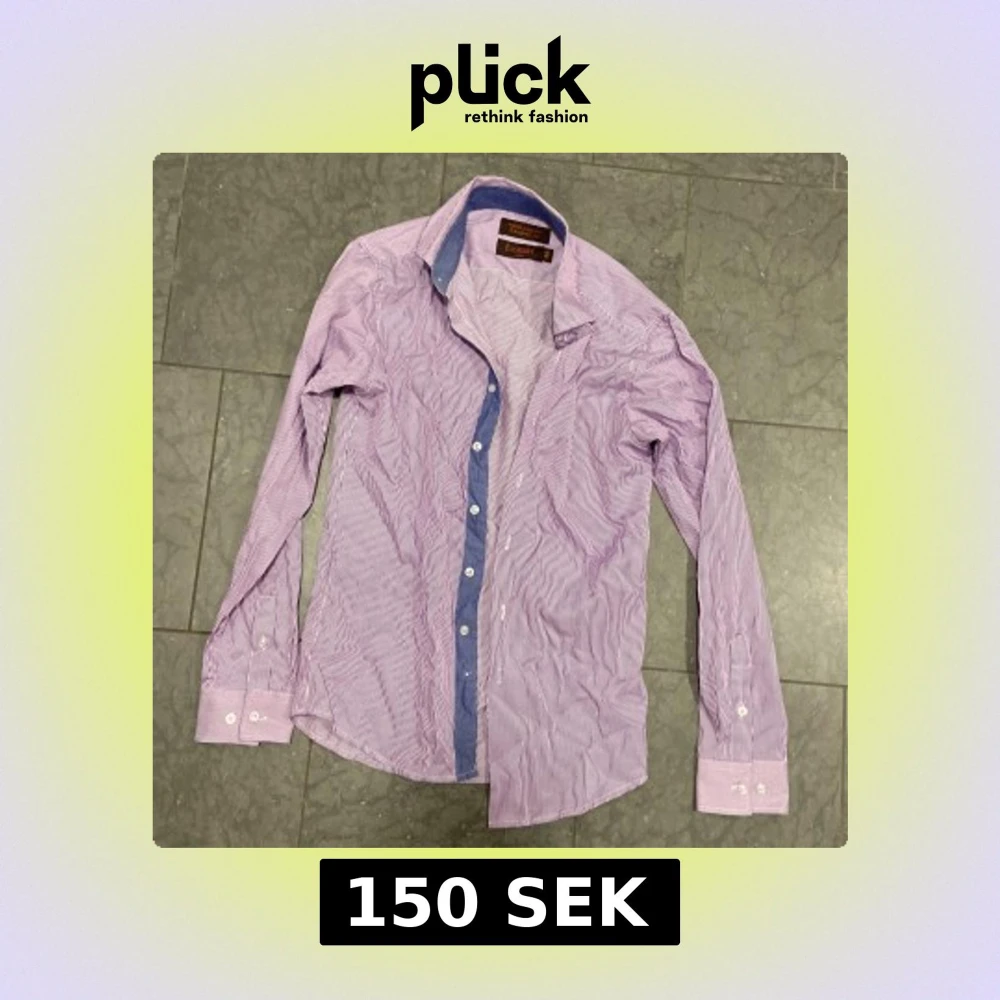 Snygg lila skjorta från Bossini med tunna vita ränder och kontrastfärgad blå insida på kragen. Skjortan har lång ärm, klassisk krage och knäppning framtill. Tillverkad i en mix av bomull och polyester för en skön känsla.