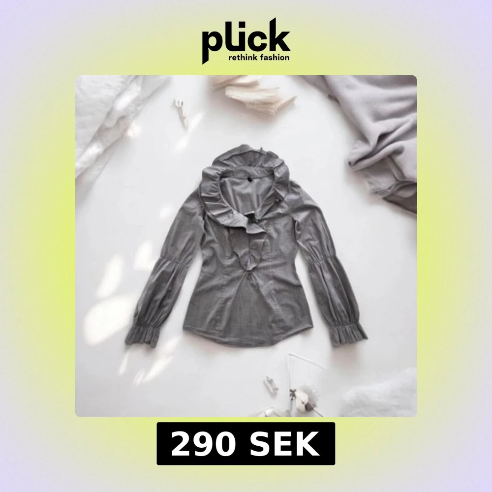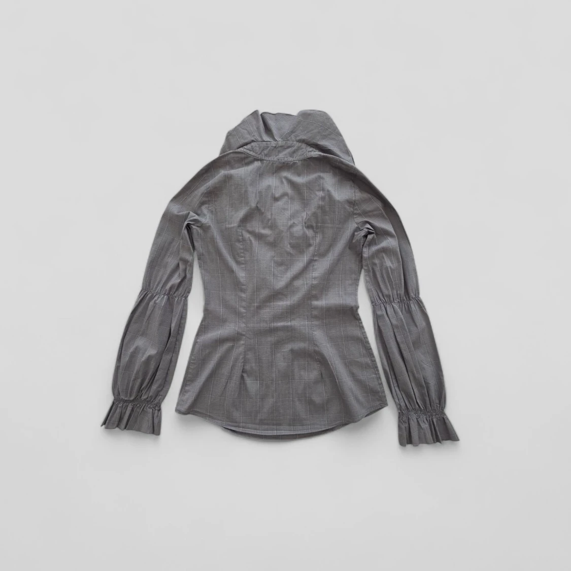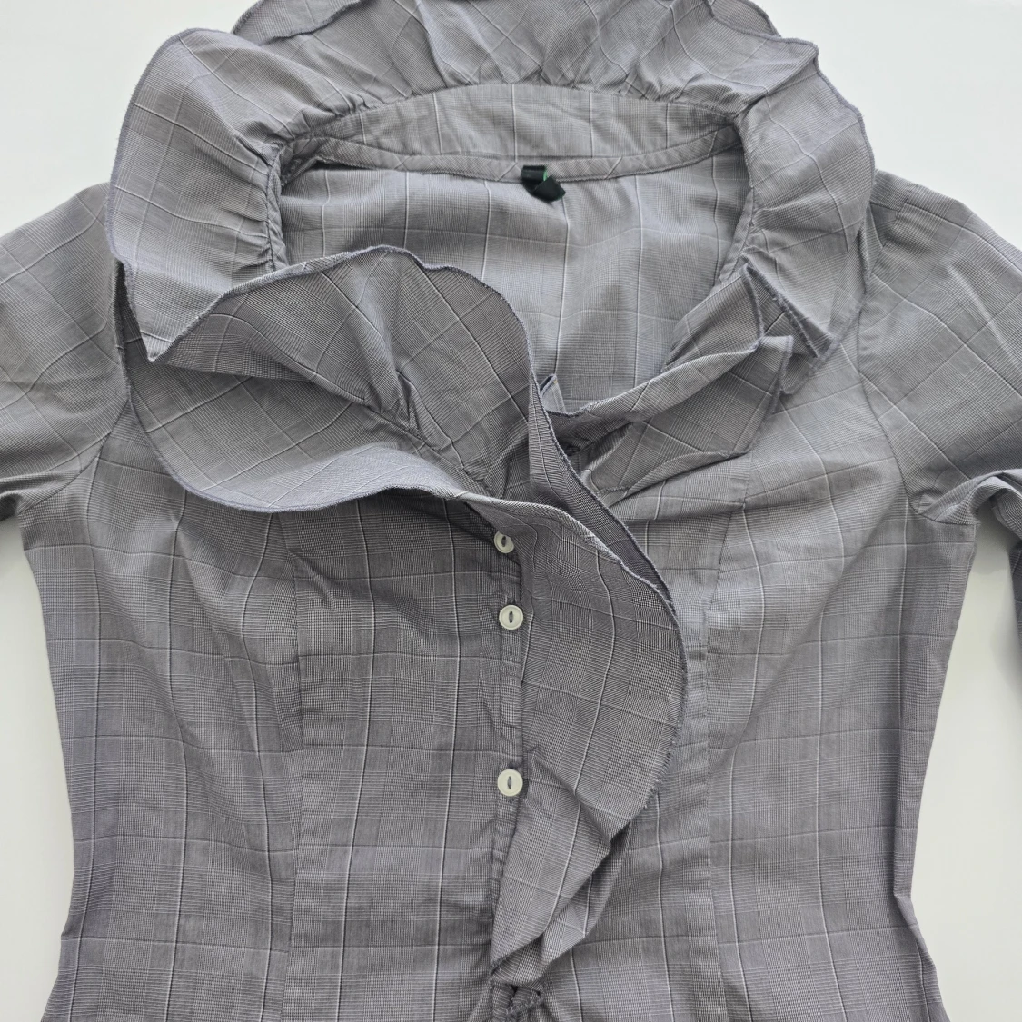 Säljer en grå blus med stor volangkrage och långa ärmar med rynkade muddar från Stile Benneton. Blusen har en figurnära passform och subtilt rutigt mönster. Perfekt för dig som vill sticka ut med en trendig och elegant look.