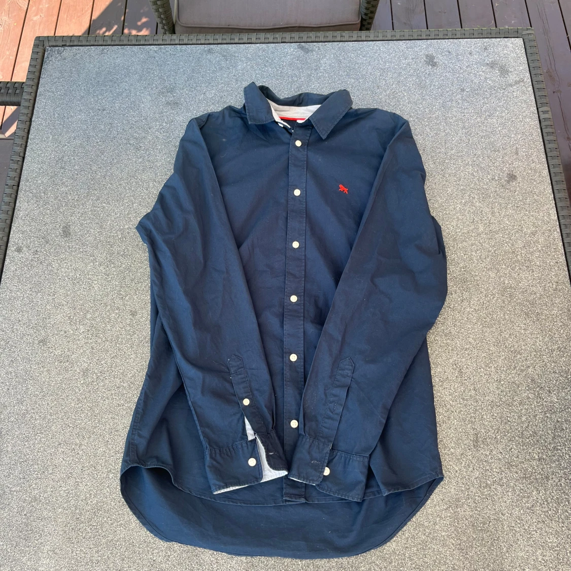 Snygg mörkblå skjorta med klassisk krage och vita knappar. På bröstet finns en liten röd broderad logga som ger en stilren touch. Skjortan har lång ärm och är tillverkad i mjuk bomull, perfekt för en clean och avslappnad look.