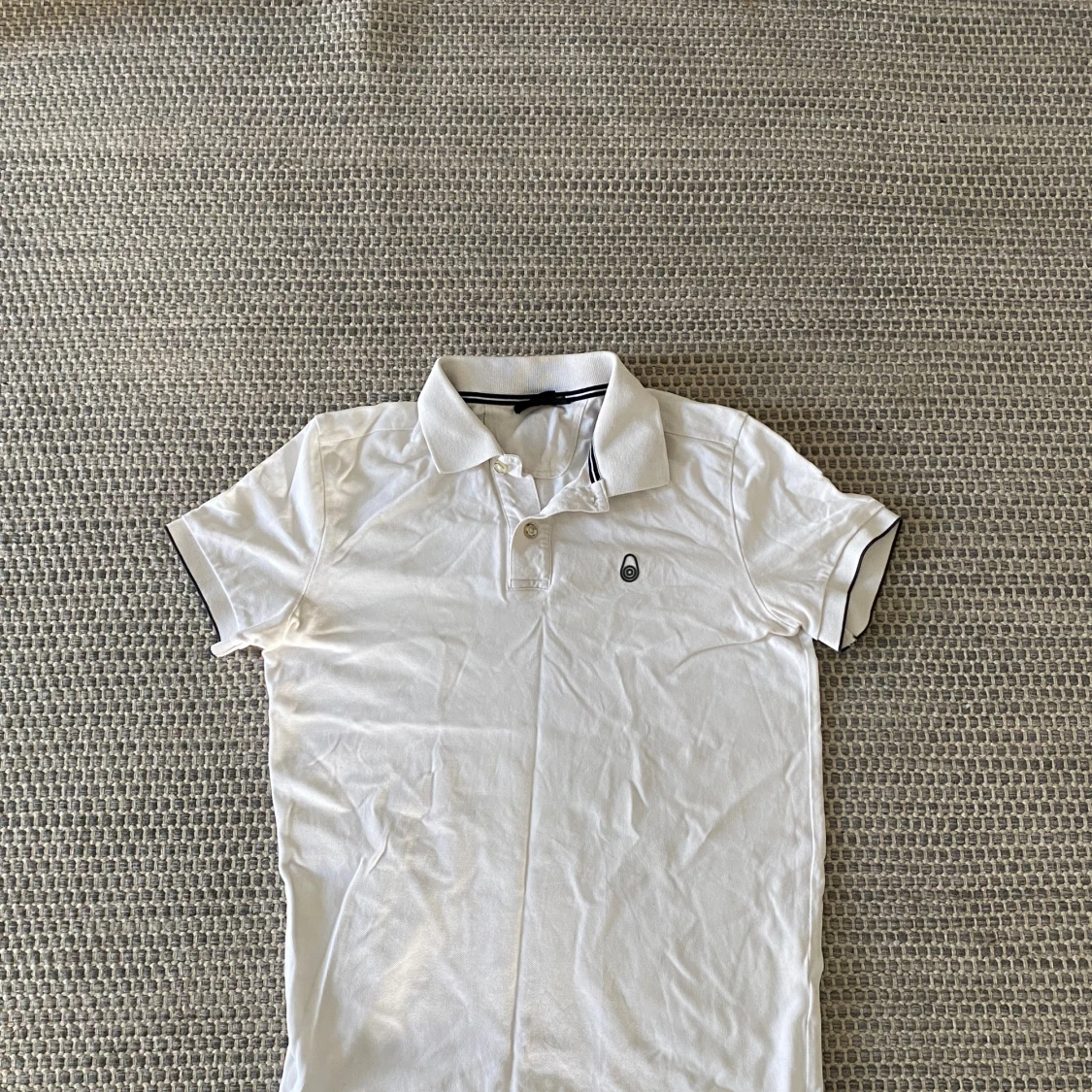 Vit pikétröja med klassisk krage och svarta detaljer på ärmslut och krage. Tröjan har korta ärmar och två knappar framtill. Liten broderad logga på bröstet ger en clean look.
