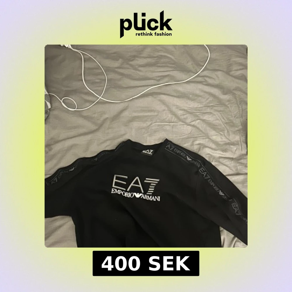 Svart sweatshirt från EA7 Emporio Armani med logga i vitt och silver på bröstet samt tryck längs ärmarna. Tröjan har rund hals och lång ärm, perfekt för dig som gillar stilrena märkeskläder med sportig vibe.