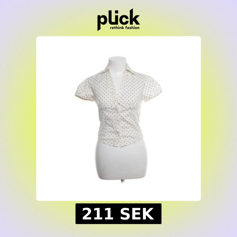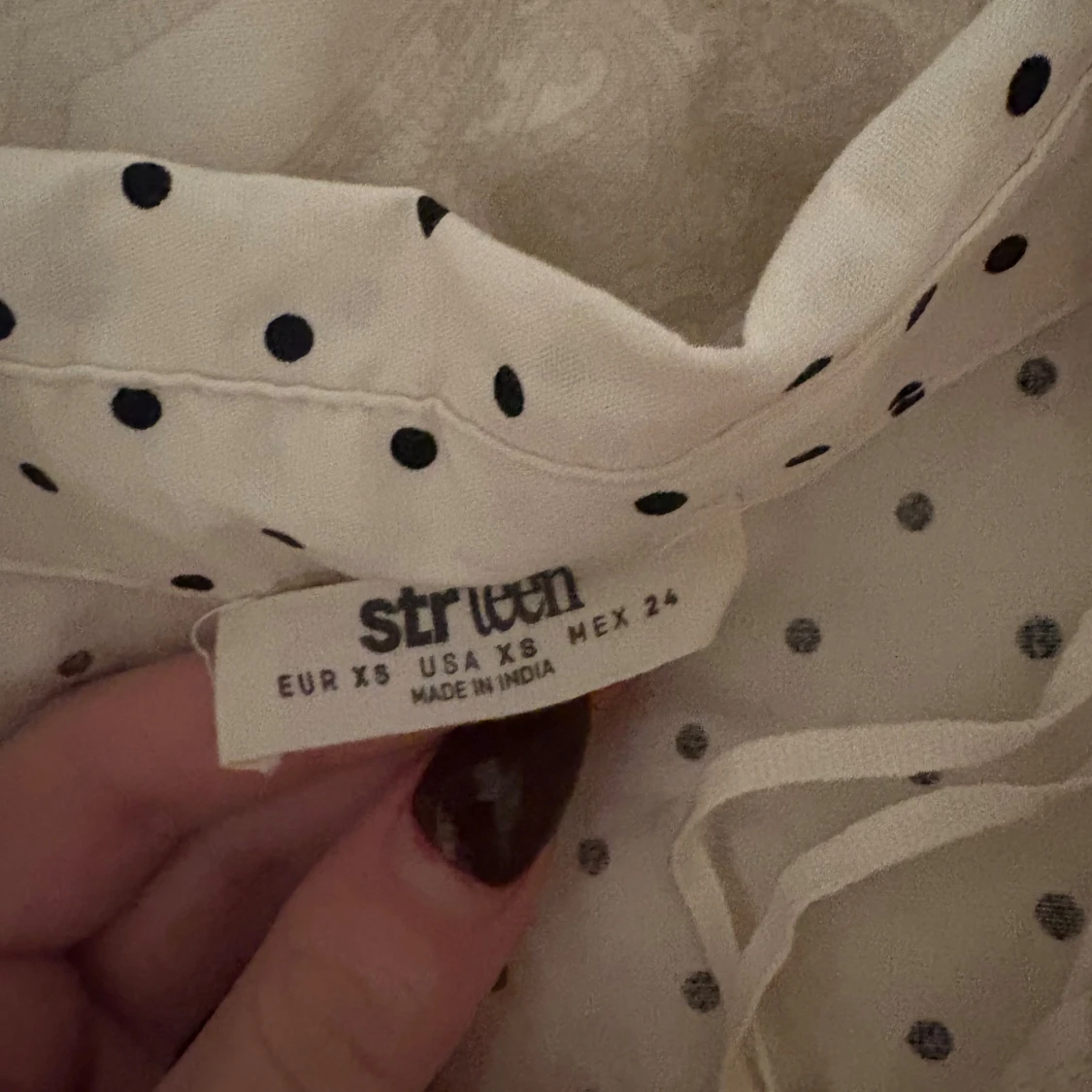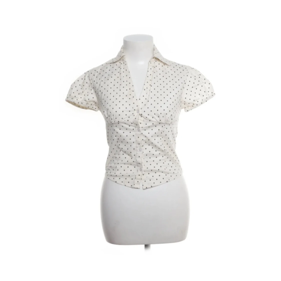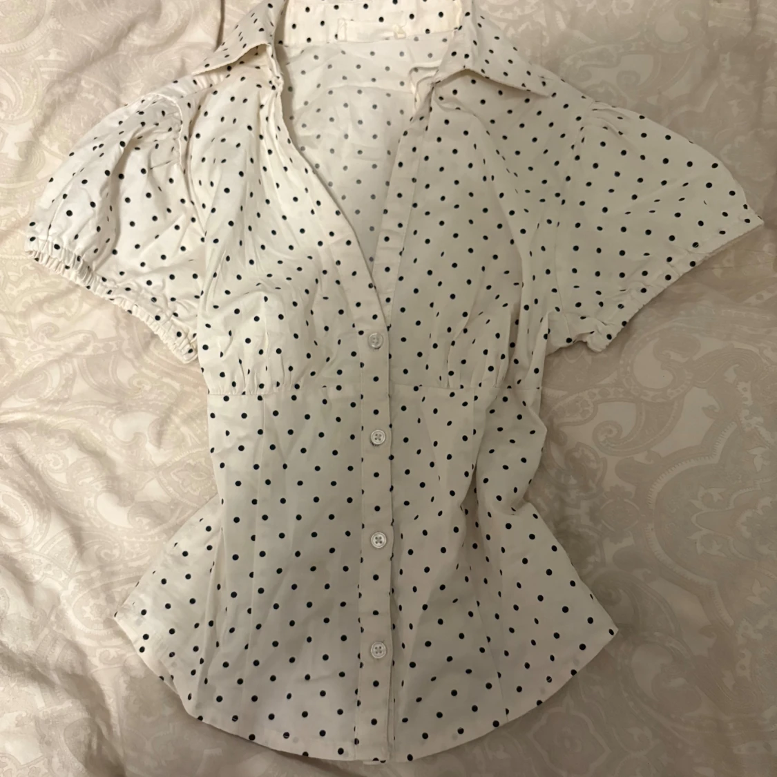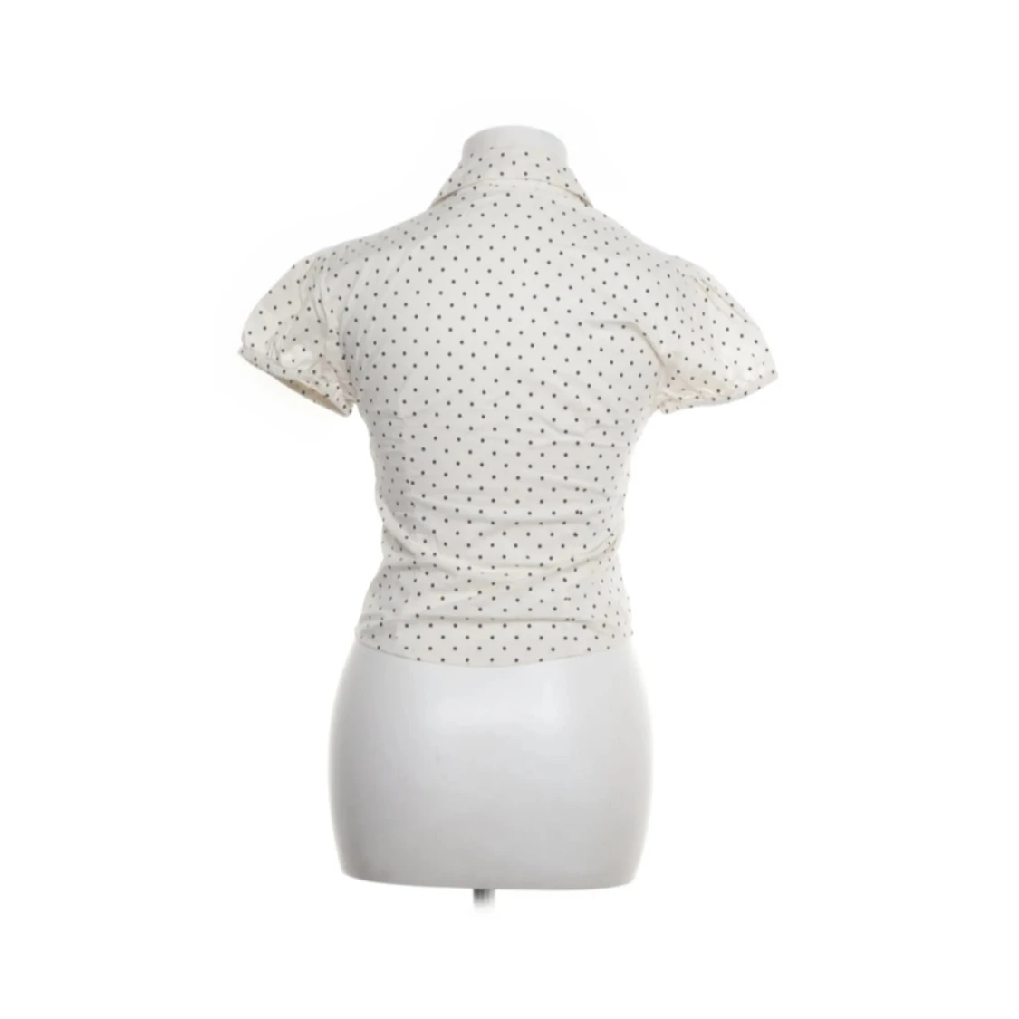Söt vit skjorta från Strteen med svarta prickar, korta puffärmar och figurnära passform. Skjortan har klassisk krage och knäppning framtill. Perfekt för dig som gillar retrovibbar och vill ha en feminin look.