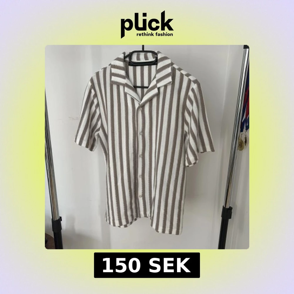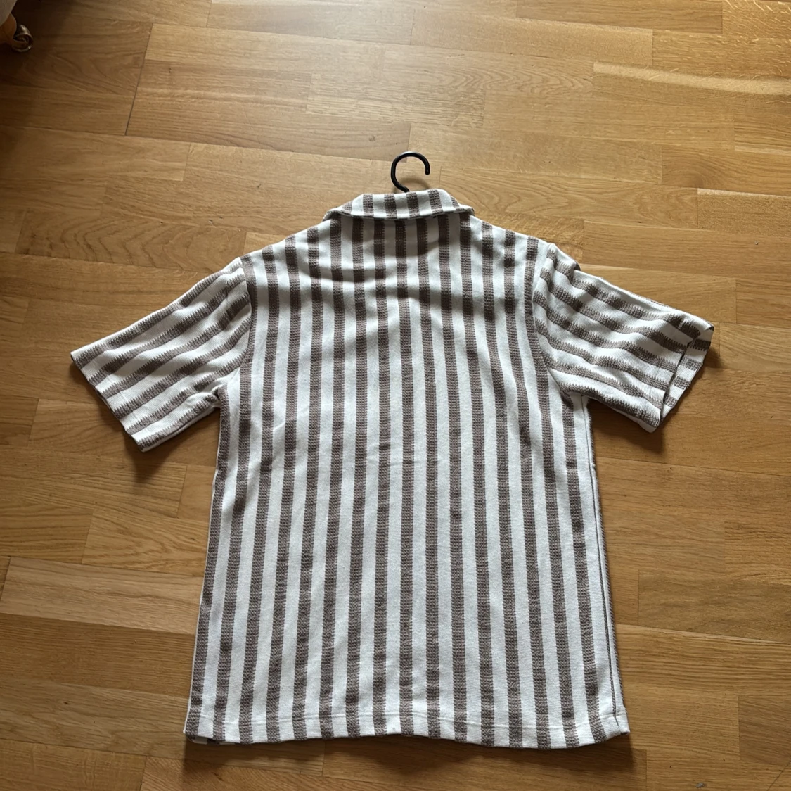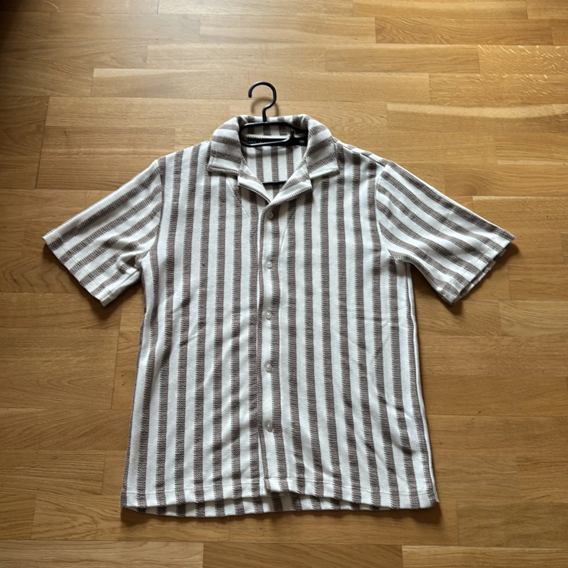 Snygg skjorta med raka, vertikala ränder i beige och vitt. Skjortan har korta ärmar, klassisk krage och knäppning framtill. Perfekt för en chill och stilren look under varmare dagar. Materialet känns mjukt och luftigt.
