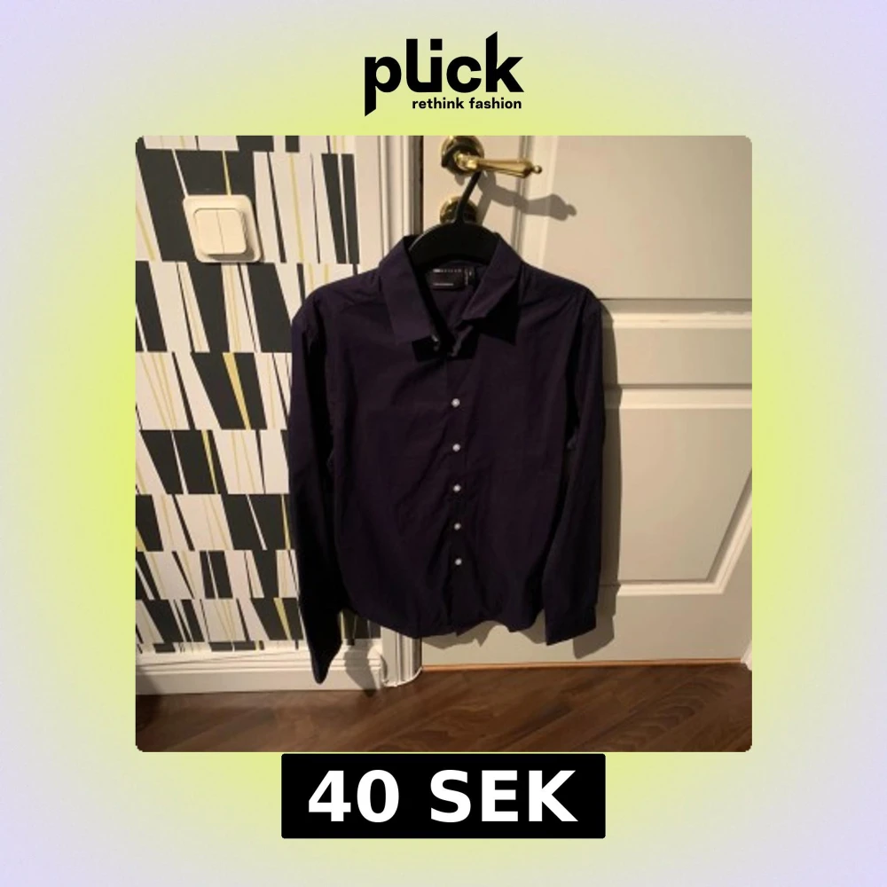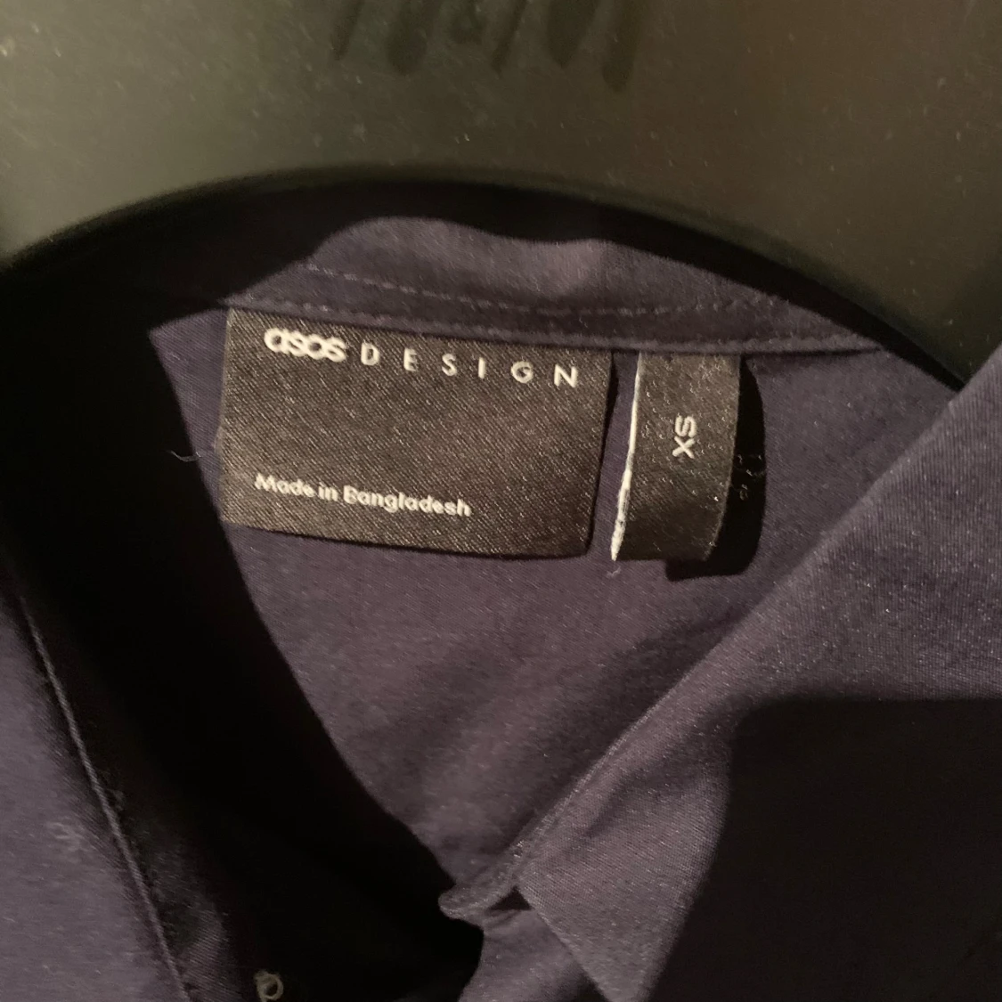 Snygg mörkblå skjorta från ASOS Design i storlek XS. Skjortan har klassisk krage, knäppning framtill med vita knappar och långa ärmar. Perfekt för dig som gillar stilrena och enkla plagg med en clean look.