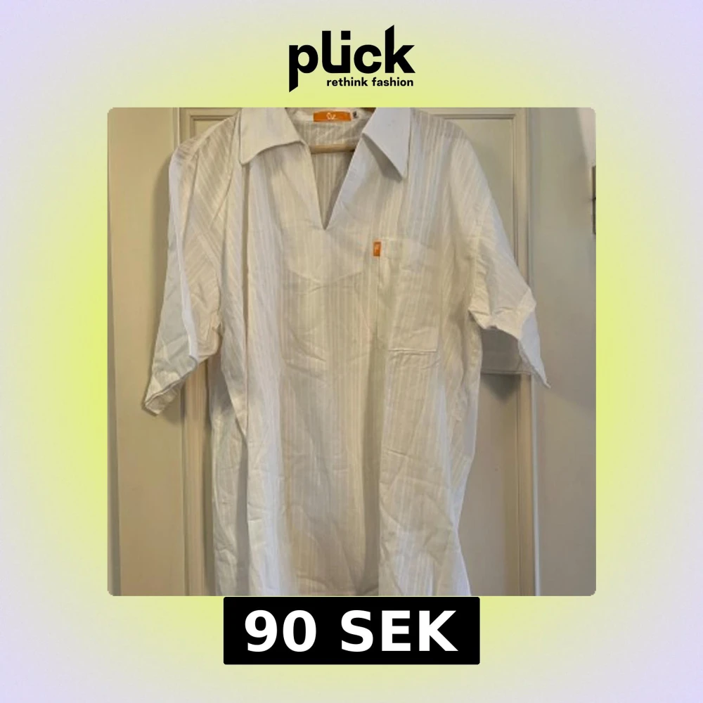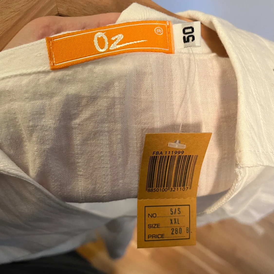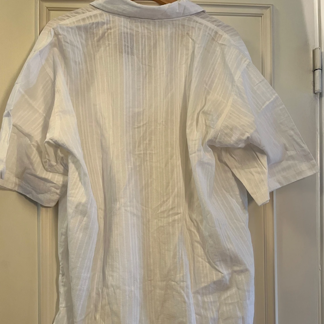 Vit henley-skjorta från O2 i storlek XXL. Skjortan har diskreta vertikala ränder, kort ärm, bröstficka och en öppen v-ringad krage. Tillverkad i lätt och luftig bomull, perfekt för varma dagar. Klassisk och stilren look med relaxed fit.