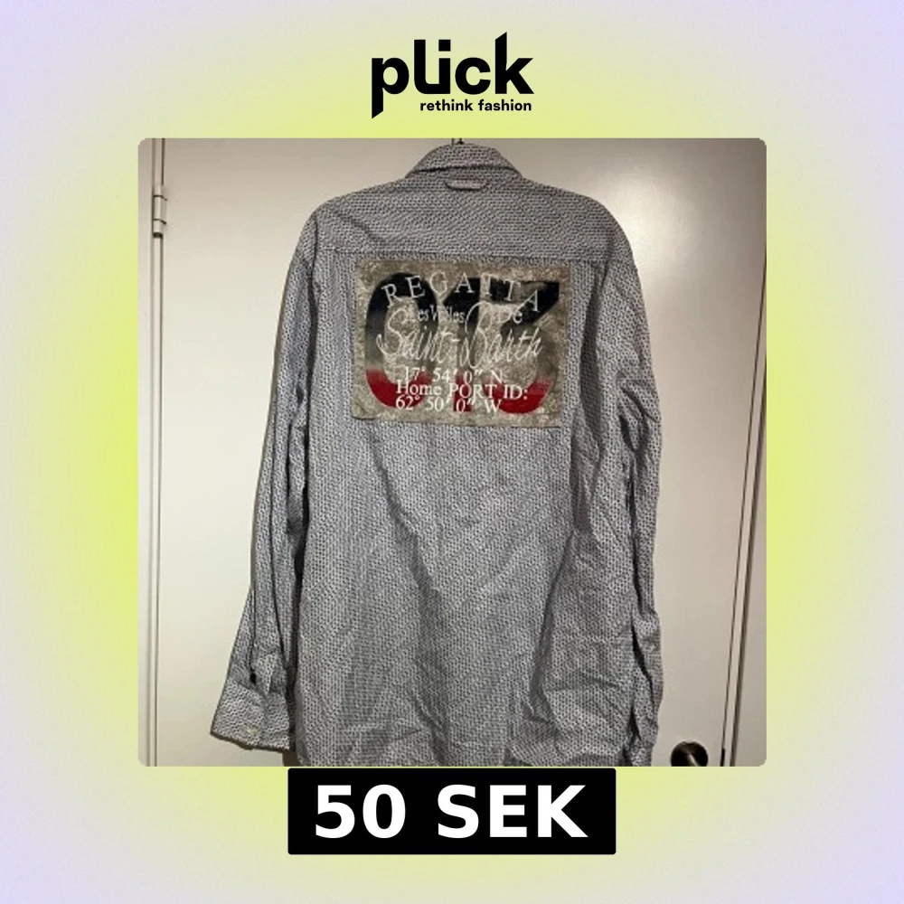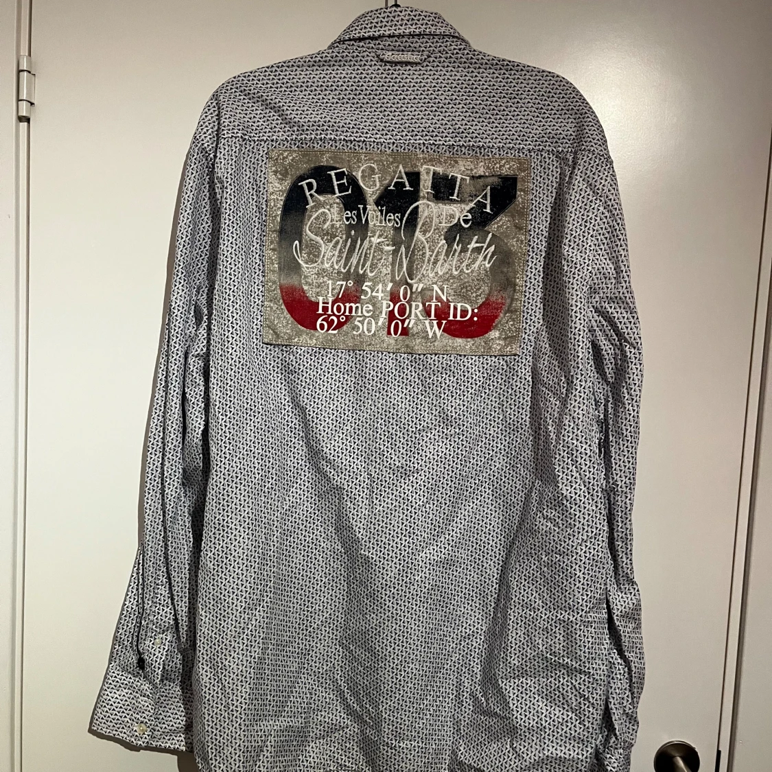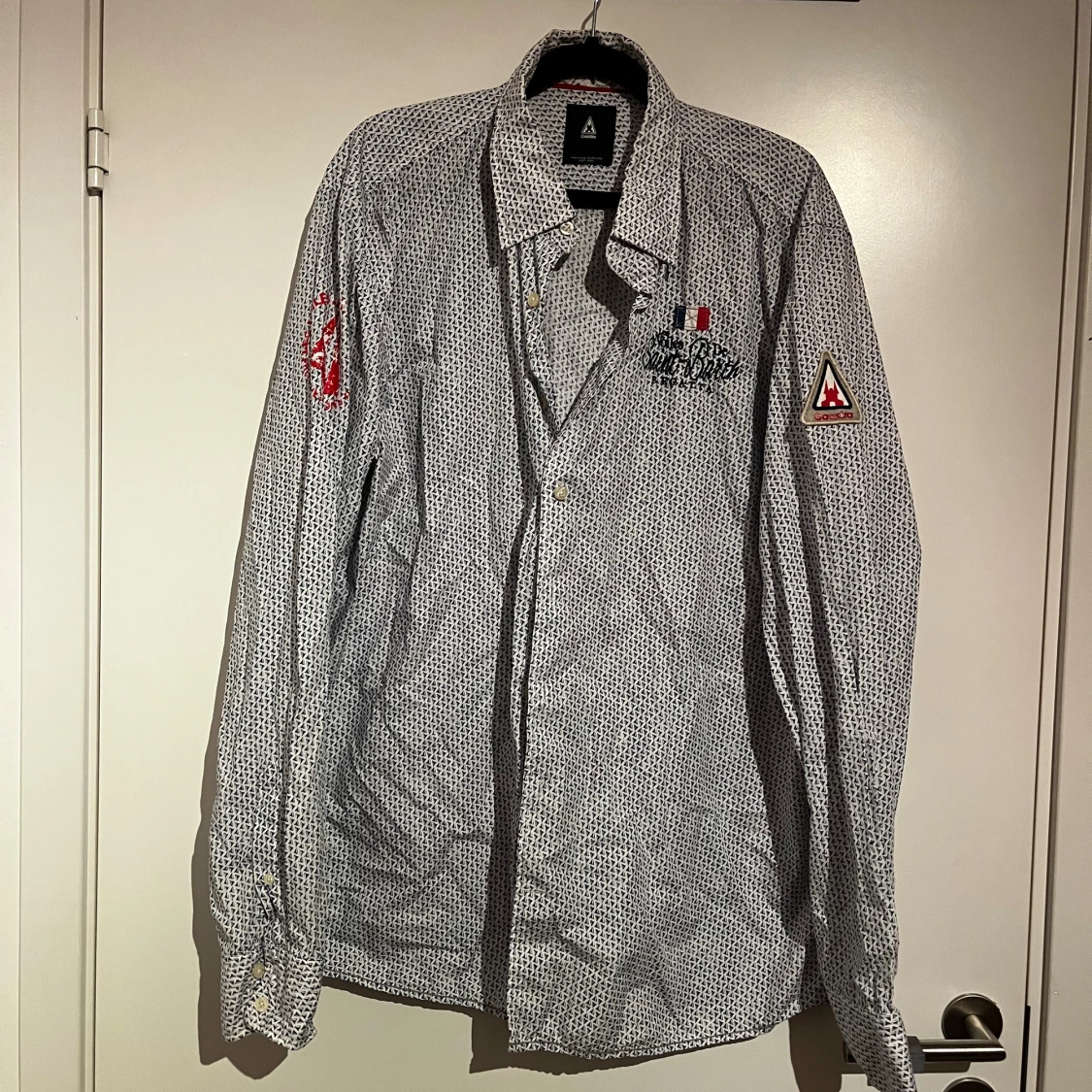 Säljer en vit och blå mönstrad skjorta från Geographical Norway med broderade detaljer och tryck på ryggen. Skjortan har klassisk krage, knappar framtill och patchar på ärmen.