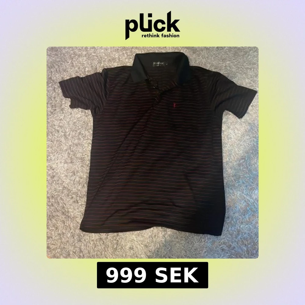Snygg svart silk pikétröja från Yves Saint Laurent med röda ränder och broderad logga på bröstet. Jätte bra för sommaren då den är luftig. Storlek L men sitter som S-M. Skick 7/10 men är inte för sliten, skriv om du undrar något eller har prisförslag!!