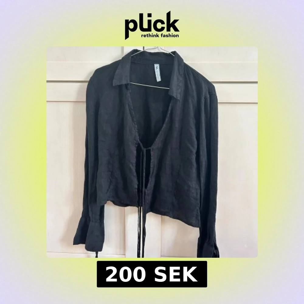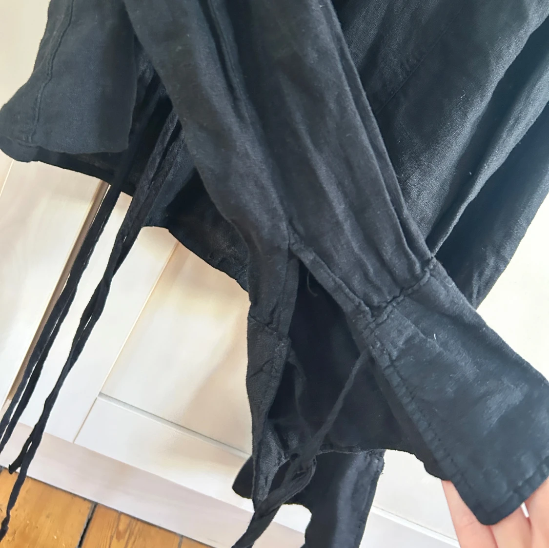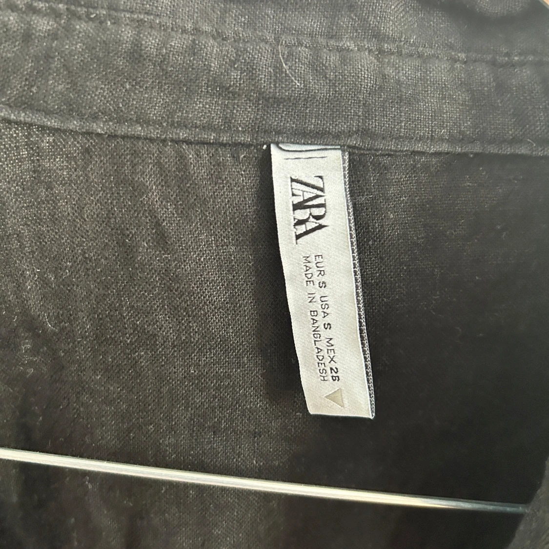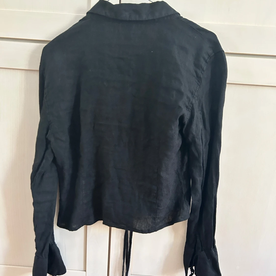 Svart croppad skjorta från Zara i linne med långa ärmar och knyt framtill och vid ärmarna. Skjortan har klassisk krage och en avslappnad passform, perfekt för en trendig look.