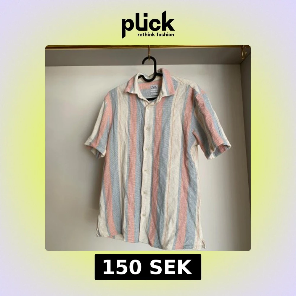 Säljer en avslappnad randig kortärmad skjorta från Zara i mjuka pastellfärger. Skjortan har korta ärmar och knappar framtill. Perfekt för en somrig look!