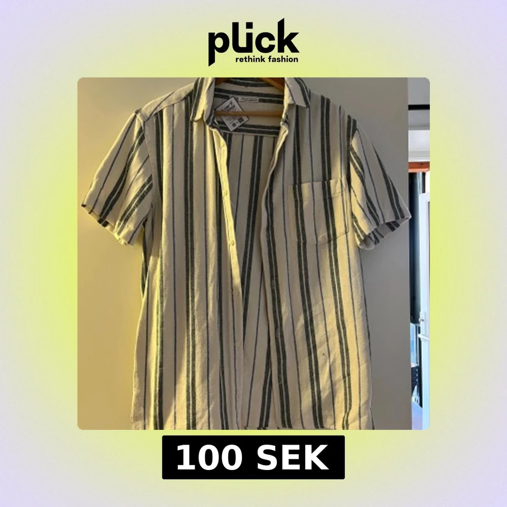 Säljer en stilren randig skjorta från Zara i vitt och grönt. Skjortan har korta ärmar och en klassisk krage. Perfekt för en avslappnad stil. Tillverkad i ett lätt och bekvämt material.