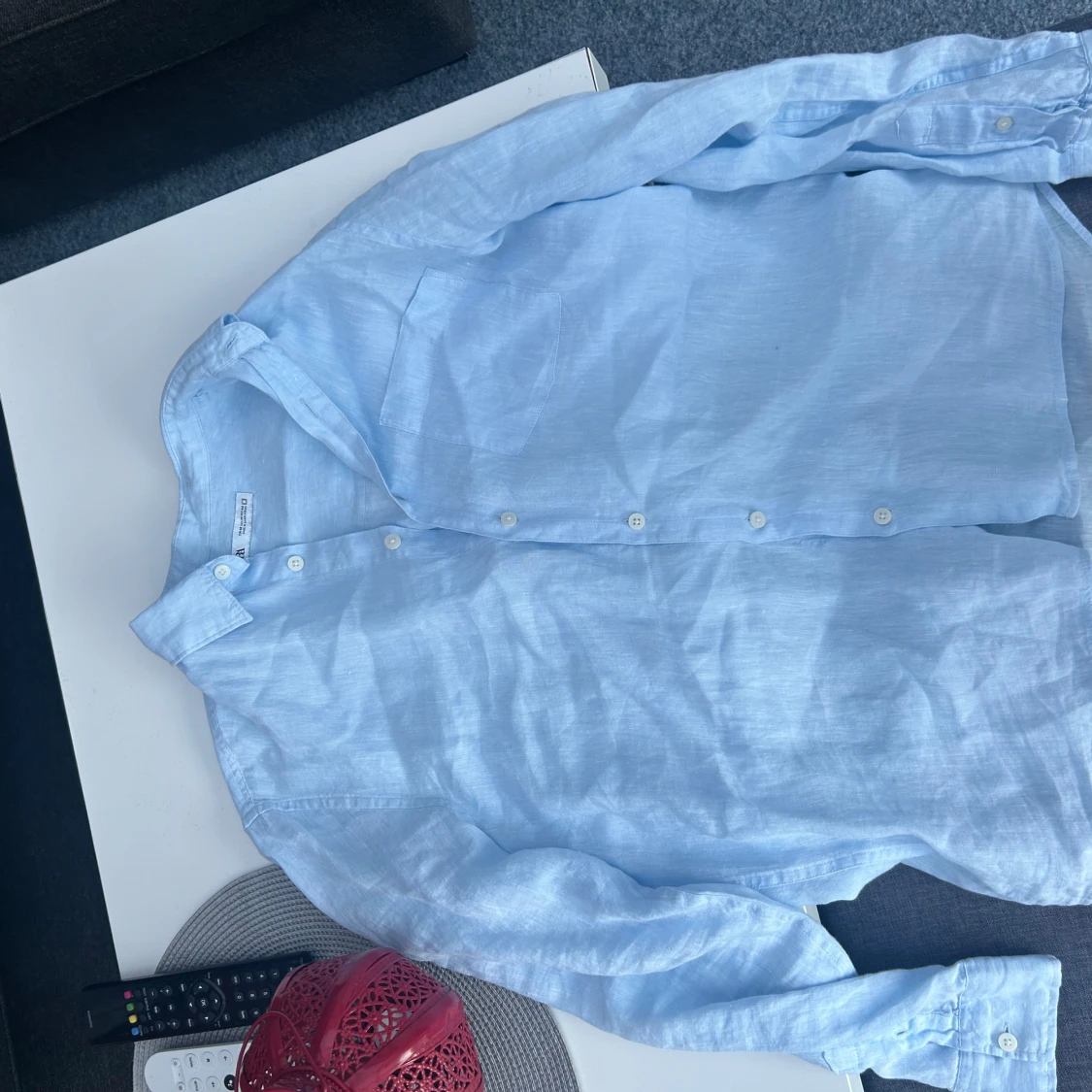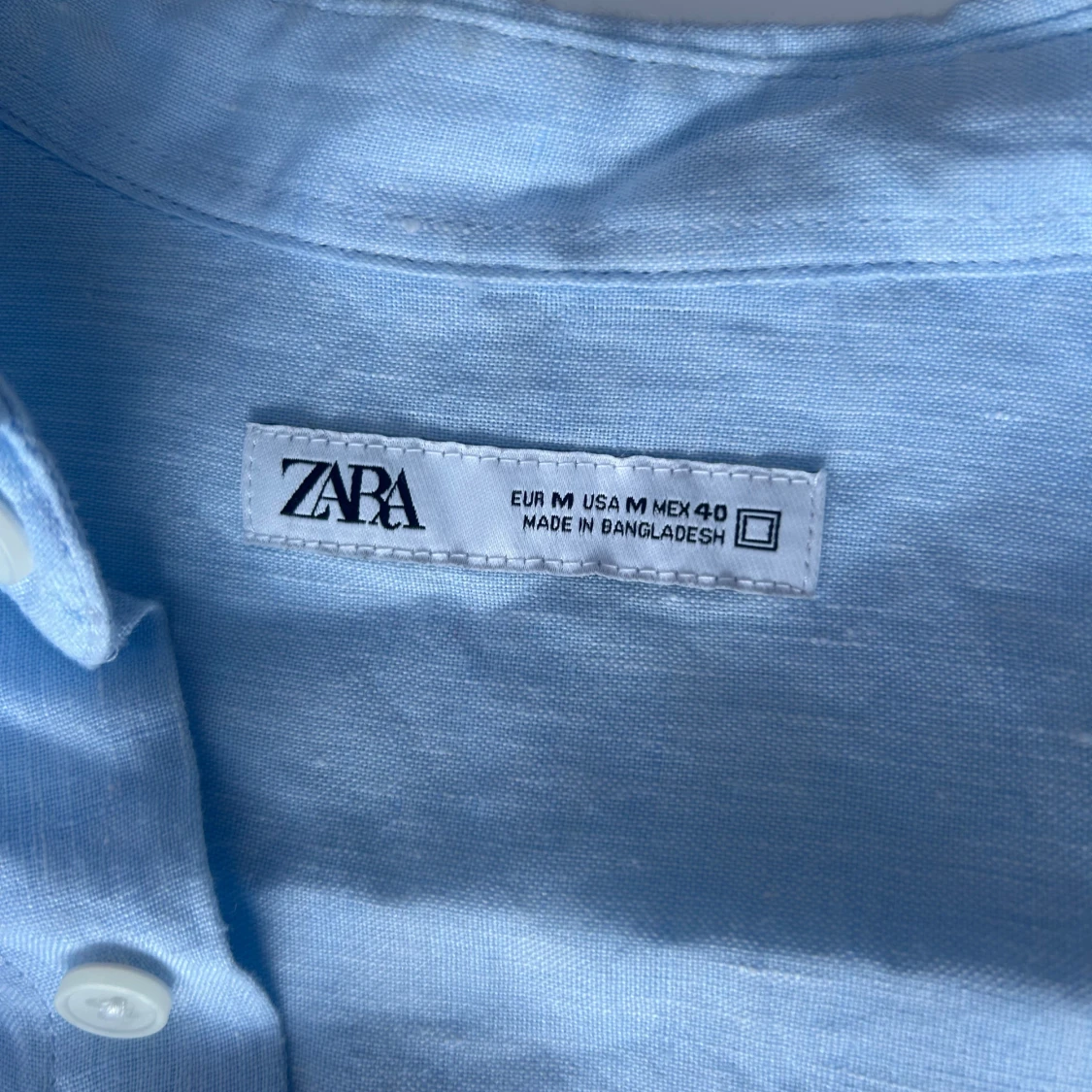 Säljer en stilren ljusblå linneskjorta från Zara. Skjortan har långa ärmar och knappar framtill. Perfekt för en avslappnad men ändå uppklädd look.