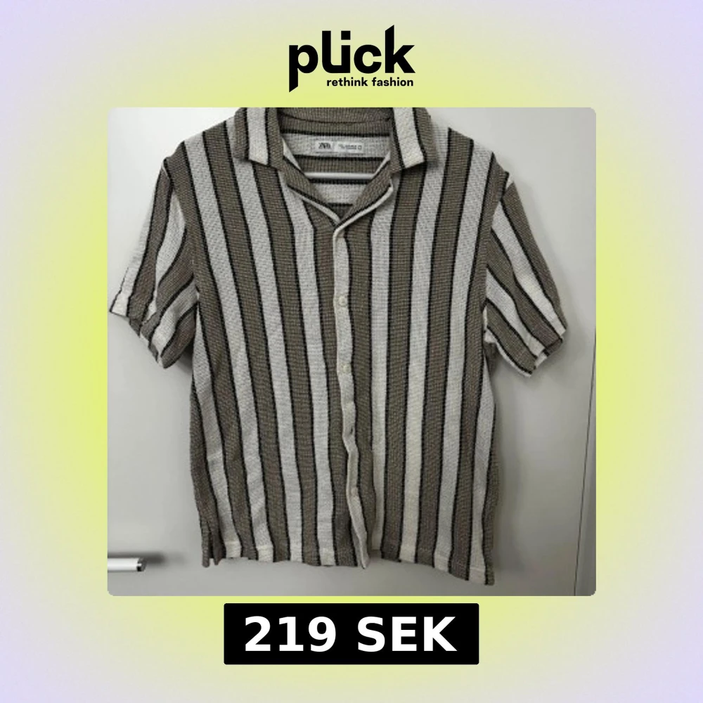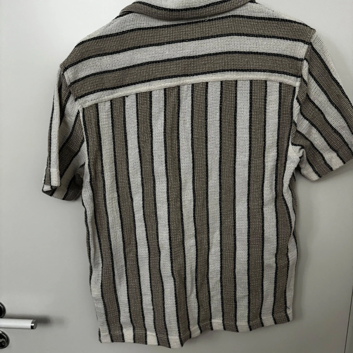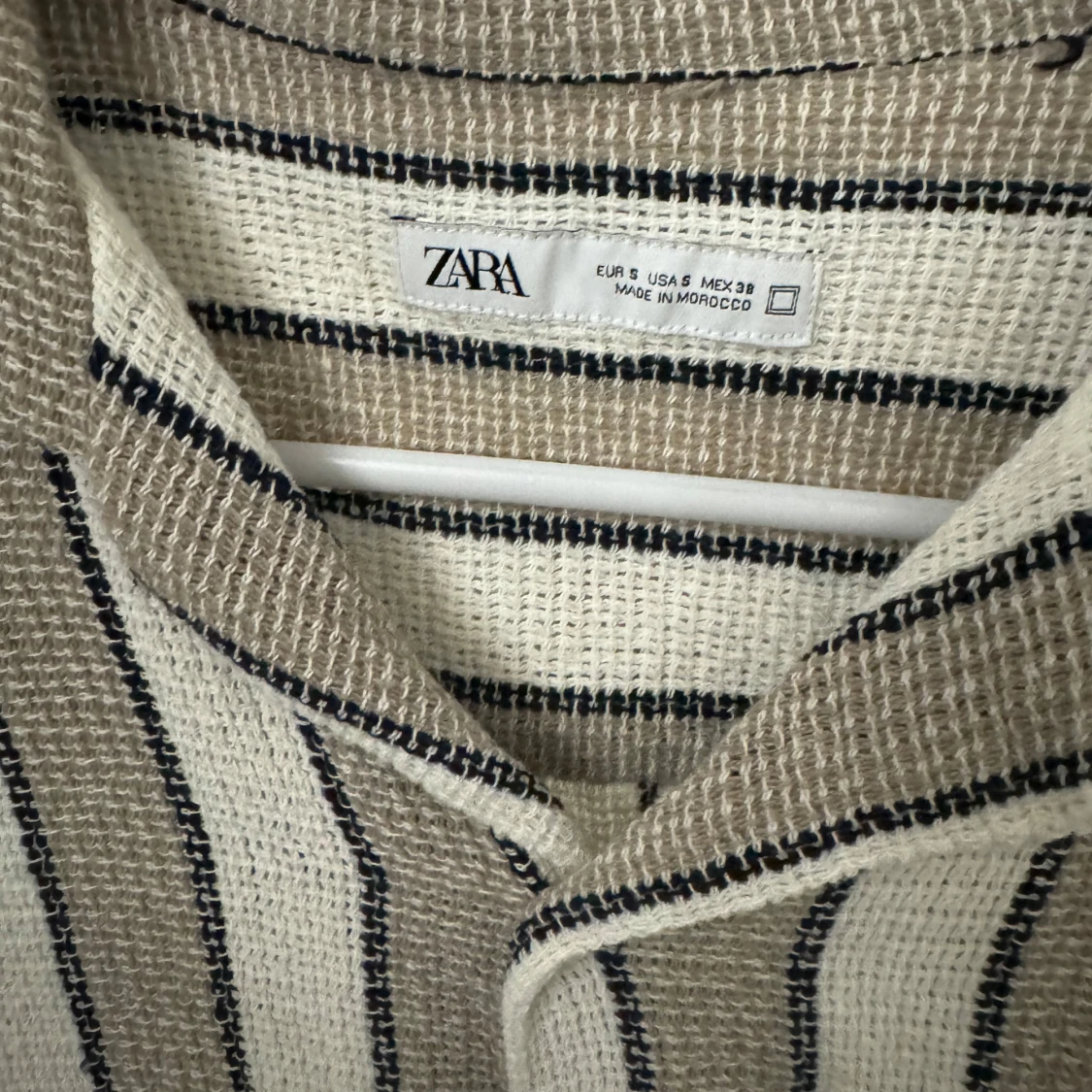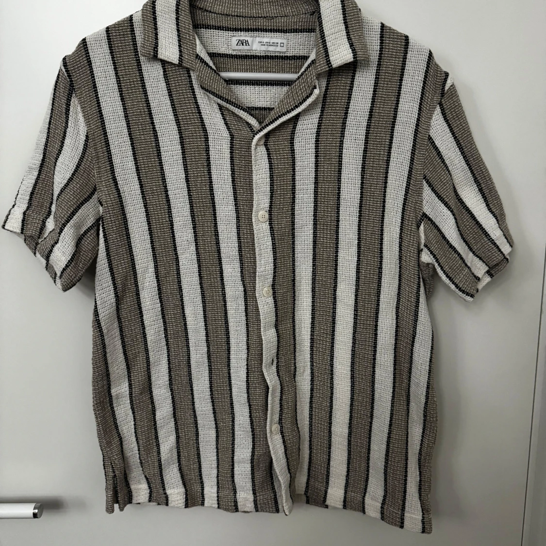 Snygg kortärmad skjorta från Zara med vertikala ränder i beige, svart och vit. Skjortan har en avslappnad passform och knappar framtill. Perfekt för en stilren look.