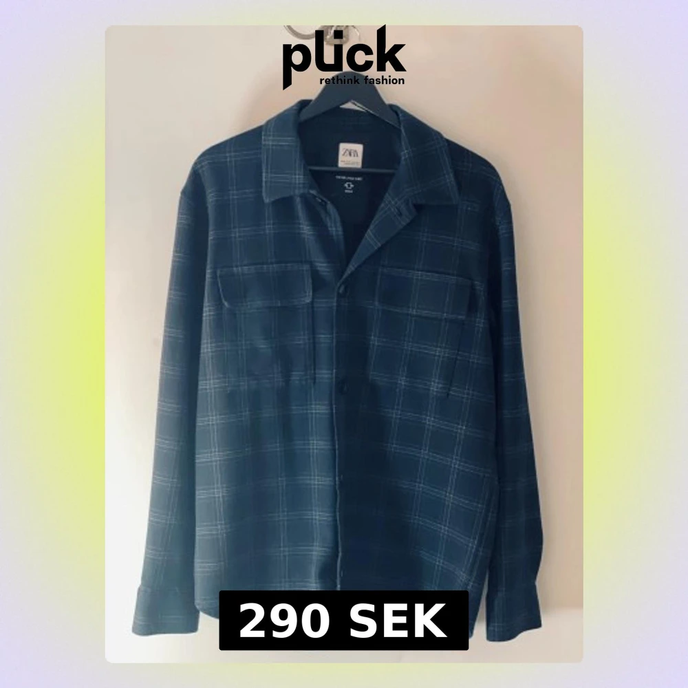 Snygg mörkblå skjorta från Zara med rutigt mönster och klassisk krage. Modellen heter The Melange Shirt och har två bröstfickor med knappar. Skjortan är långärmad och har en loose passform, perfekt för en chill och stilren look.