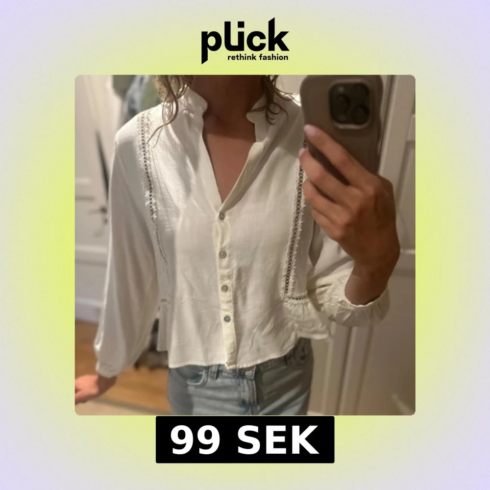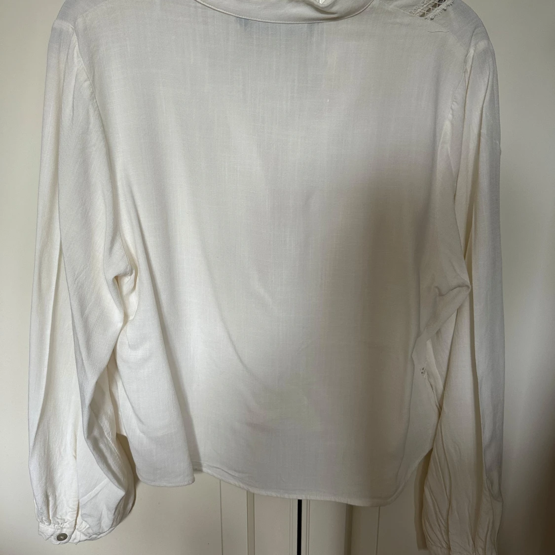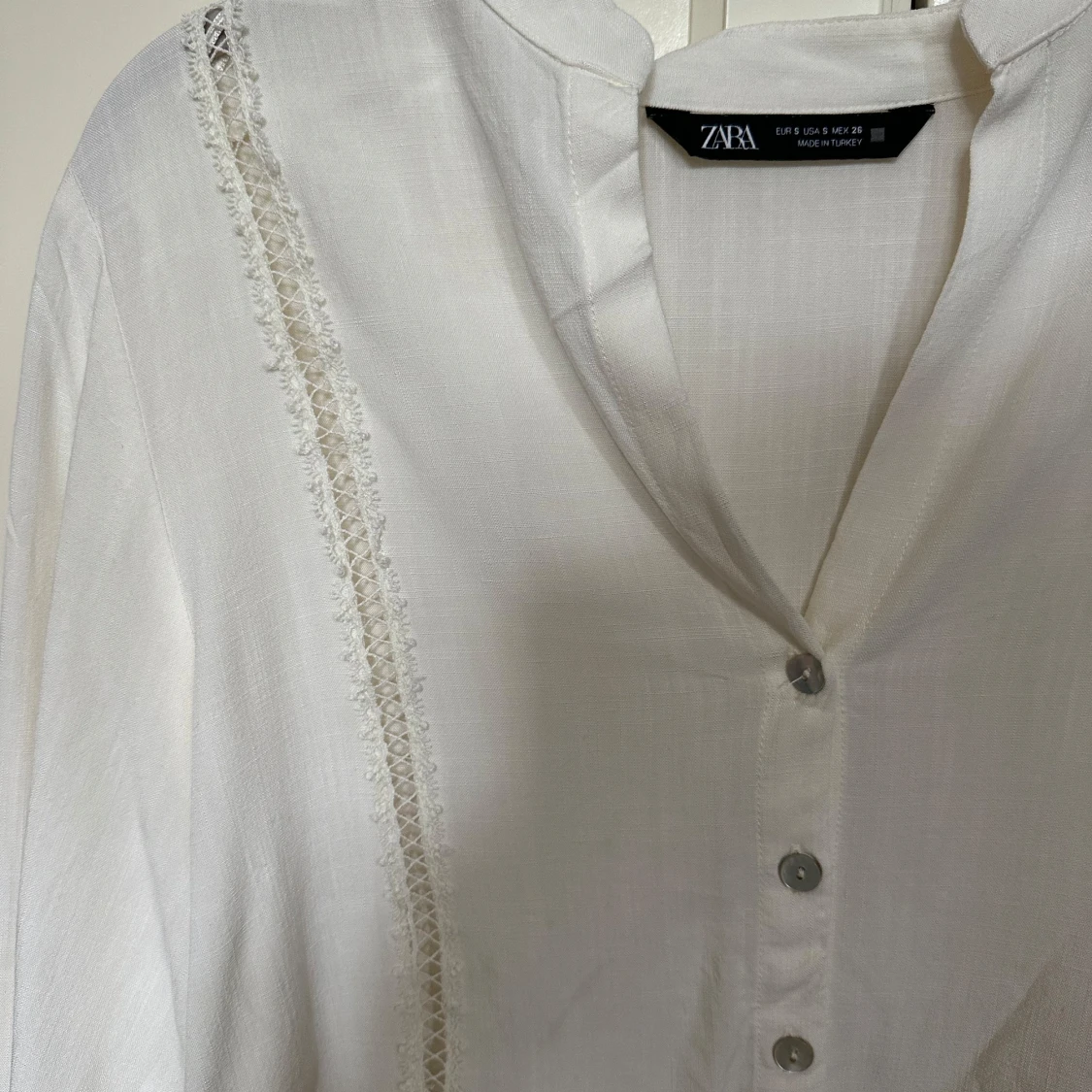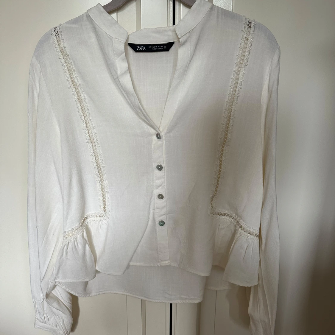 Supersöt vit blus från Zara med snygga spetsdetaljer längs framsidan. Använd 1 gång. Blusen har v-ringning, knappar framtill och långa ärmar med lätt puff. Materialet känns luftigt och skönt, perfekt till jeans eller kjol.