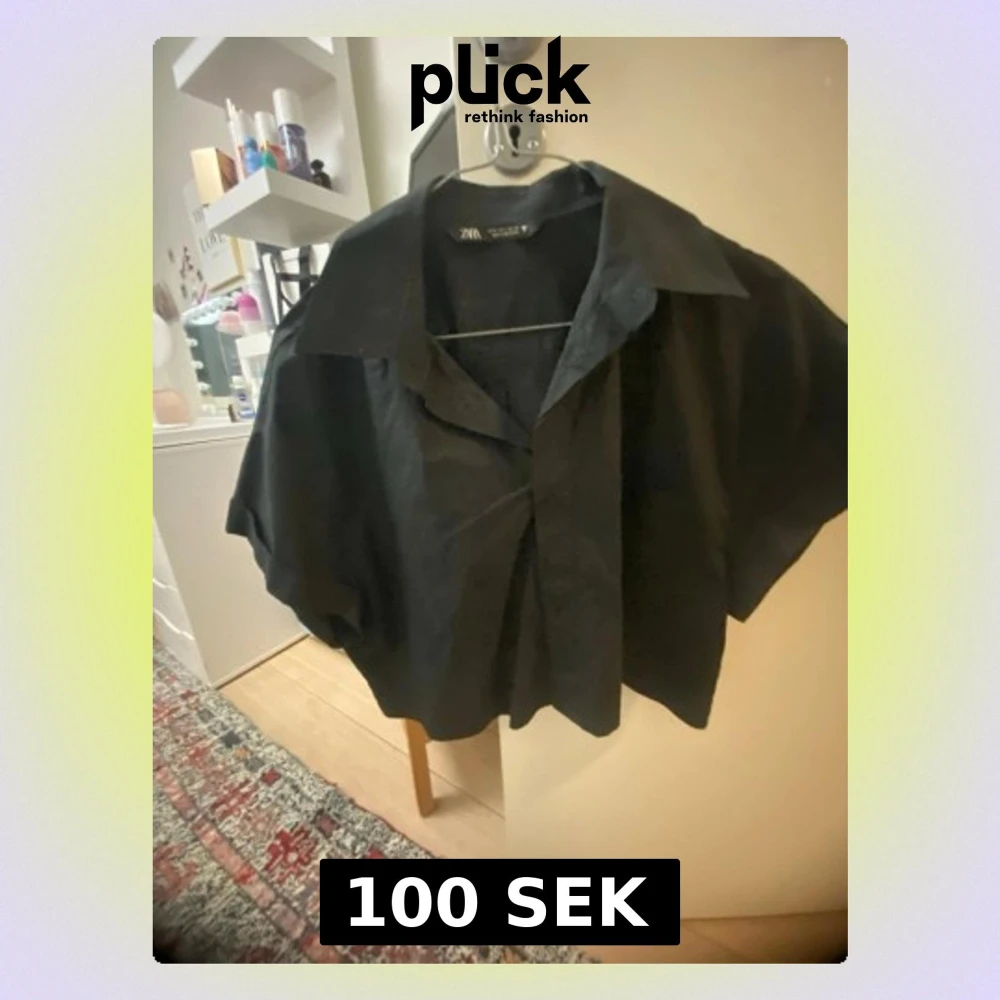 Snygg svart croppad skjorta från Zara med bred krage och korta ärmar. Skjortan har en loose passform och är tillverkad i ett lätt tyg som känns skönt mot huden. Perfekt för dig som gillar en avslappnad men trendig stil.