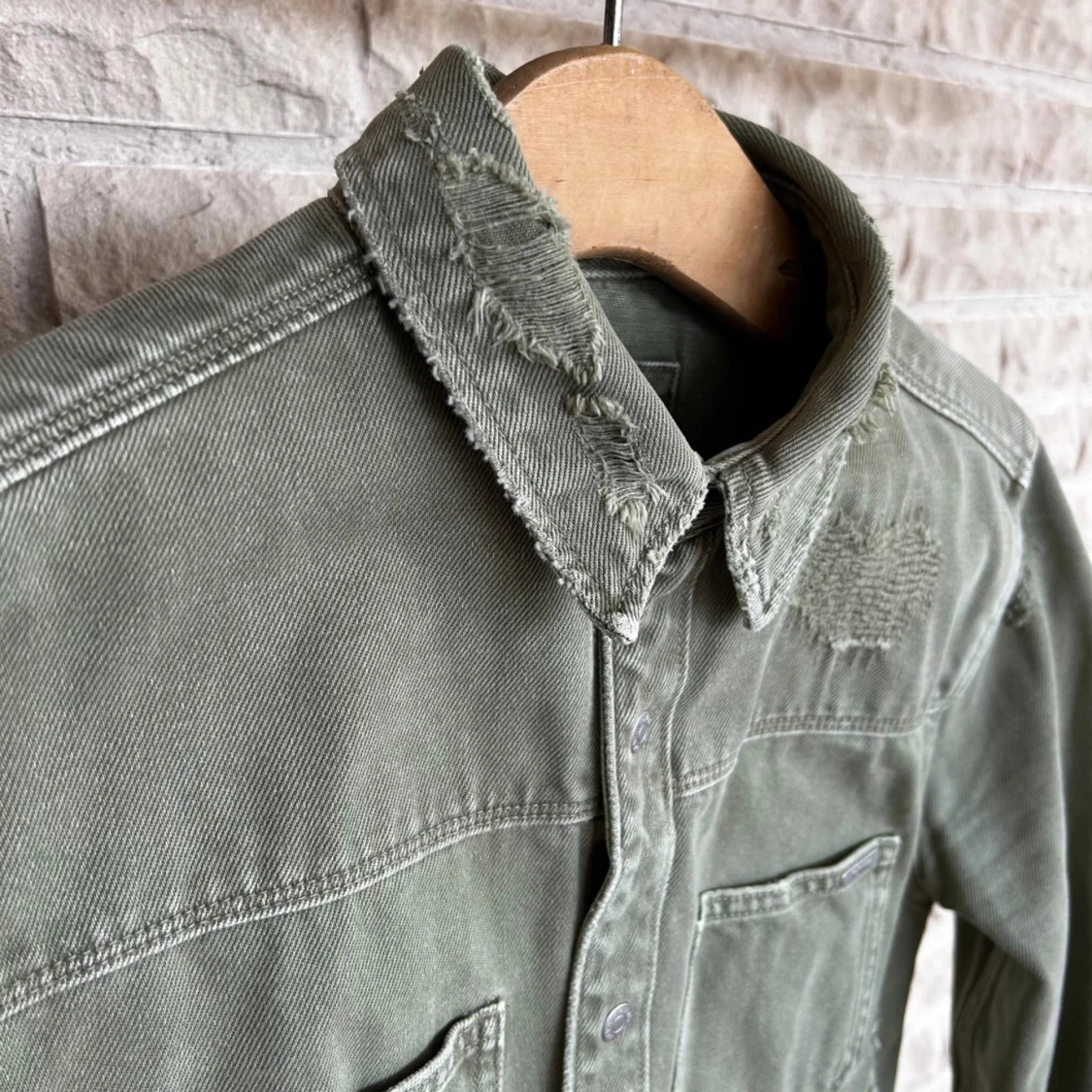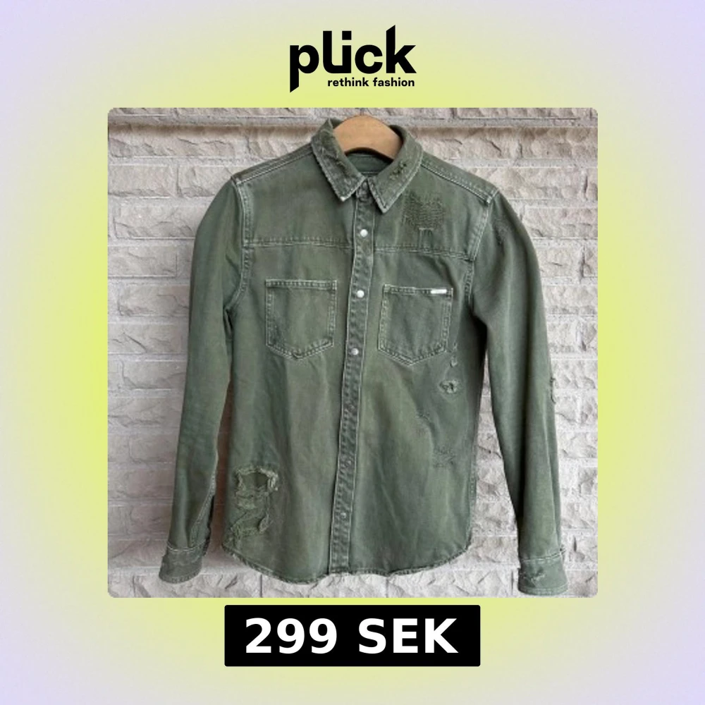 Säljer en grön jeansskjorta med coola slitna detaljer. Skjortan har långa ärmar och två bröstfickor med knappar. Perfekt för en avslappnad och trendig look. Passar bra till både vardag och fest!